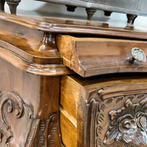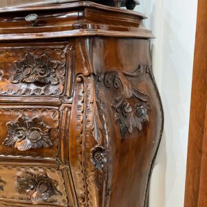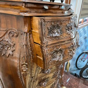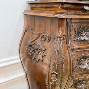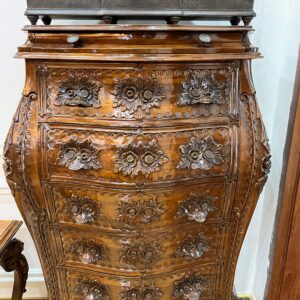 Tủ gỗ, chất liệu gỗ thịt, xuất xứ Pháp, toàn thân họa tiết được đục tay rất đẹp. 6 ngăn kéo to với phần tay cầm được cách điệu hình bông hoa, 1 ngăn kéo nhỏ trên cùng.