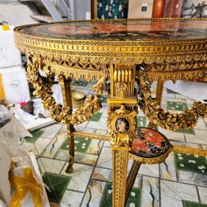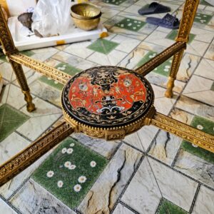 Chiếc bàn đồng ,phần chân và khung bàn bằng đồng kết hợp với mặt bàn bằng sứ họa tiết đẹp xuất sắc.