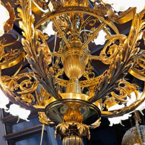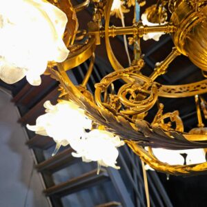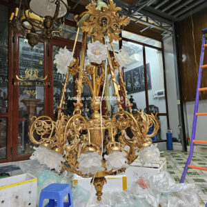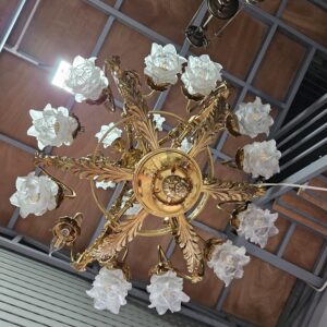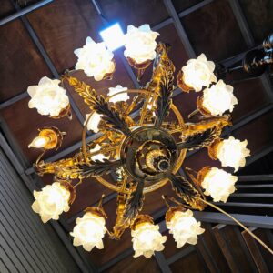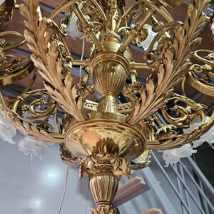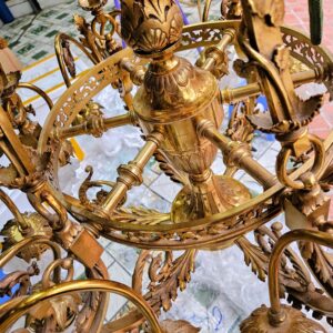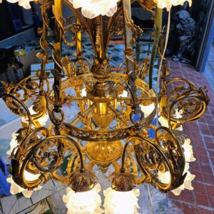 Đèn chùm Pháp, đèn bằng đồng lacke vàng rất đẹp. Đèn 18 ngọn 2 tầng, tầng dưới 12, tầng trên 6 ngọn.