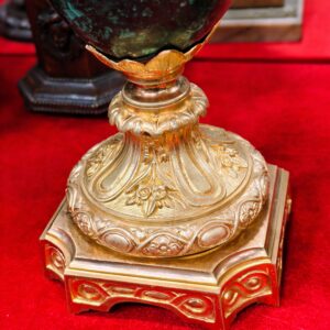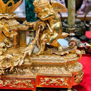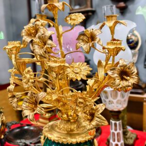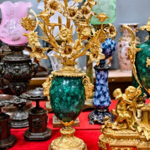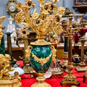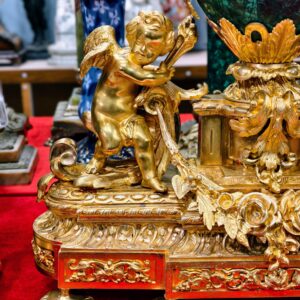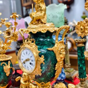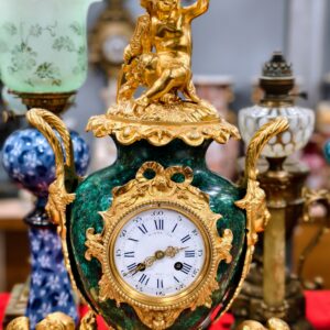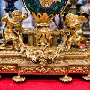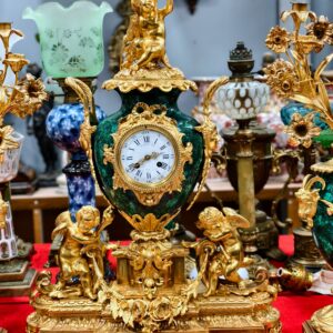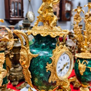 Bộ đồng hồ tượng, sự kết hợp giữa tượng đồng mạ vàng và đá Malachite sang trọng, đẳng cấp. Chính giữa là đồng hồ và tượng 3 thiên thần. 2 bên là 2 lọ hoa bằng đồng lacke vàng tinh xảo.