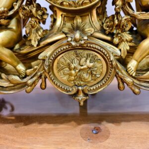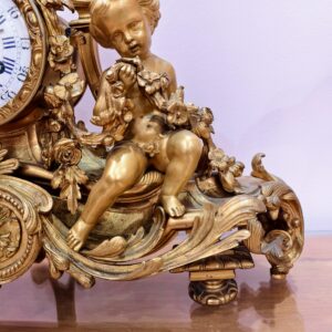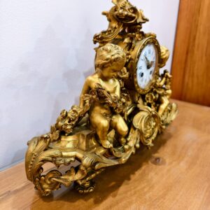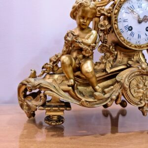 Đồng hồ tượng, xuất xứ Pháp. Đồng hồ với các họa tiết bằng đồng được chế tác cực kỳ tinh xảo, hai bên là hai thiên thần cầm hoa, chính giữa là cặp chim biểu tượng sự an lành.