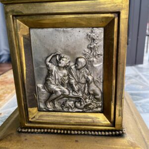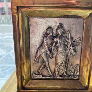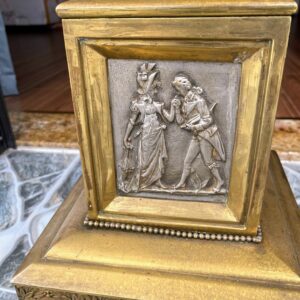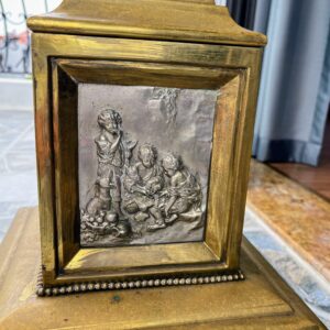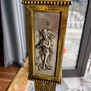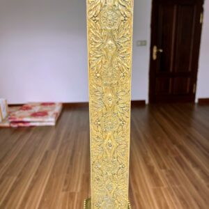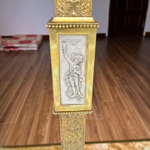 Đèn dầu cây, thân đèn bằng đồng, bốn mặt thân đèn với họa tiết tinh xảo kết hợp 8 bức tranh đồng mạ bạc độc đáo. Phần thân có thể nâng lên thêm 30-40cm nhờ suốt ở giữa.