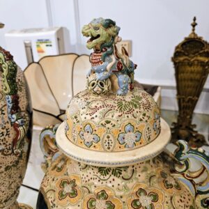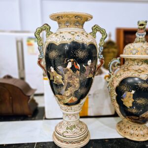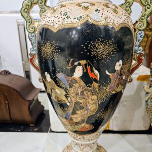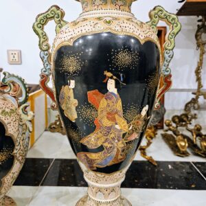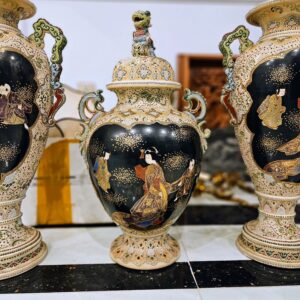 Bộ gốm satsuma 3 món, 2 bình 1 đỉnh. Họa tiết trên bình được đắp nổi vẽ vàng cực kỳ tỉ mỉ sắc nét đến từng chi tiết. Trên thân bình là bức tranh các cô gái mặc kimono truyền thống của Nhật.