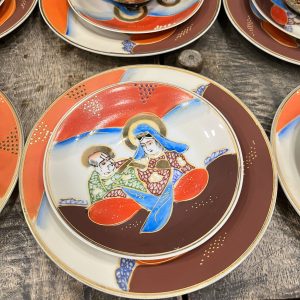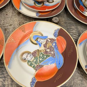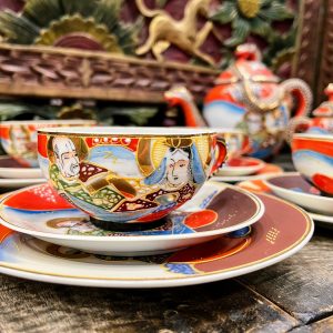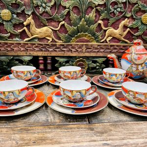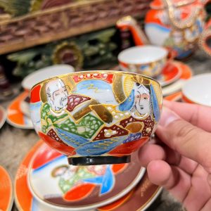 Bộ gồm 6 chén với 2 lớp đĩa bên dưới, 1 ấm, 1 chén hũ đường và 1 ấm nhỏ sữa. Chén siêu mỏng, phía đáy có hình cô gái Nhật khi soi dưới ánh sáng.