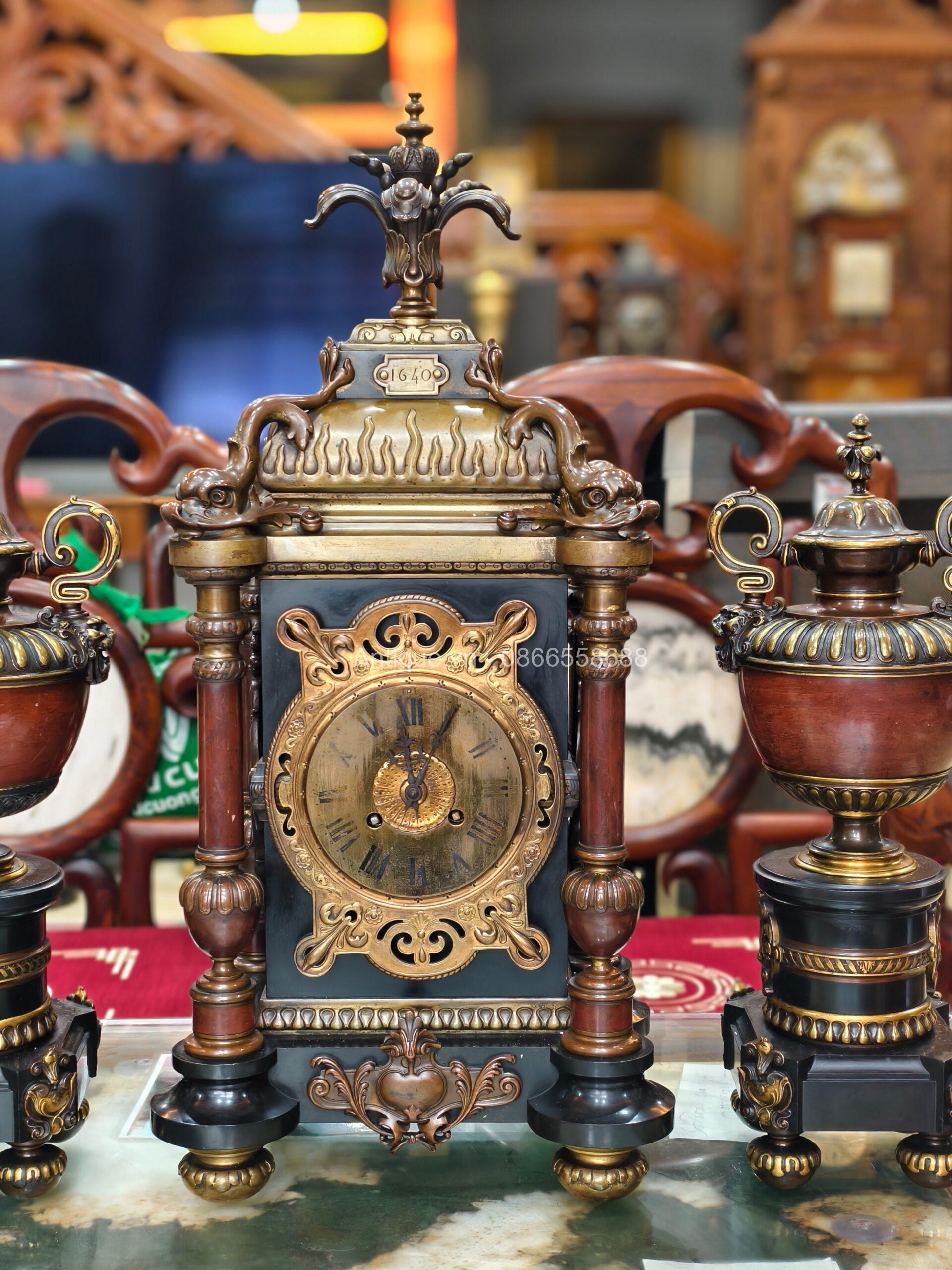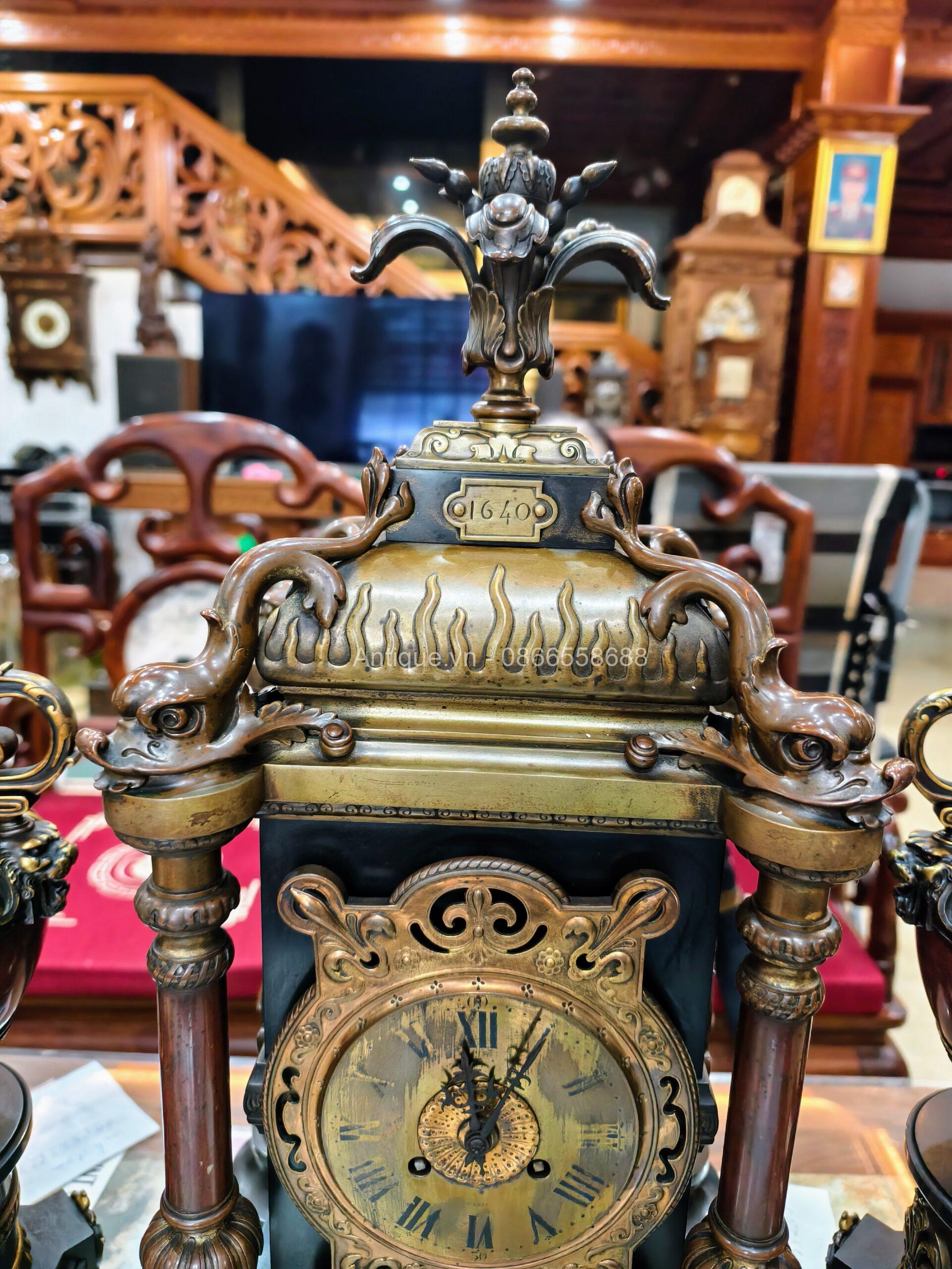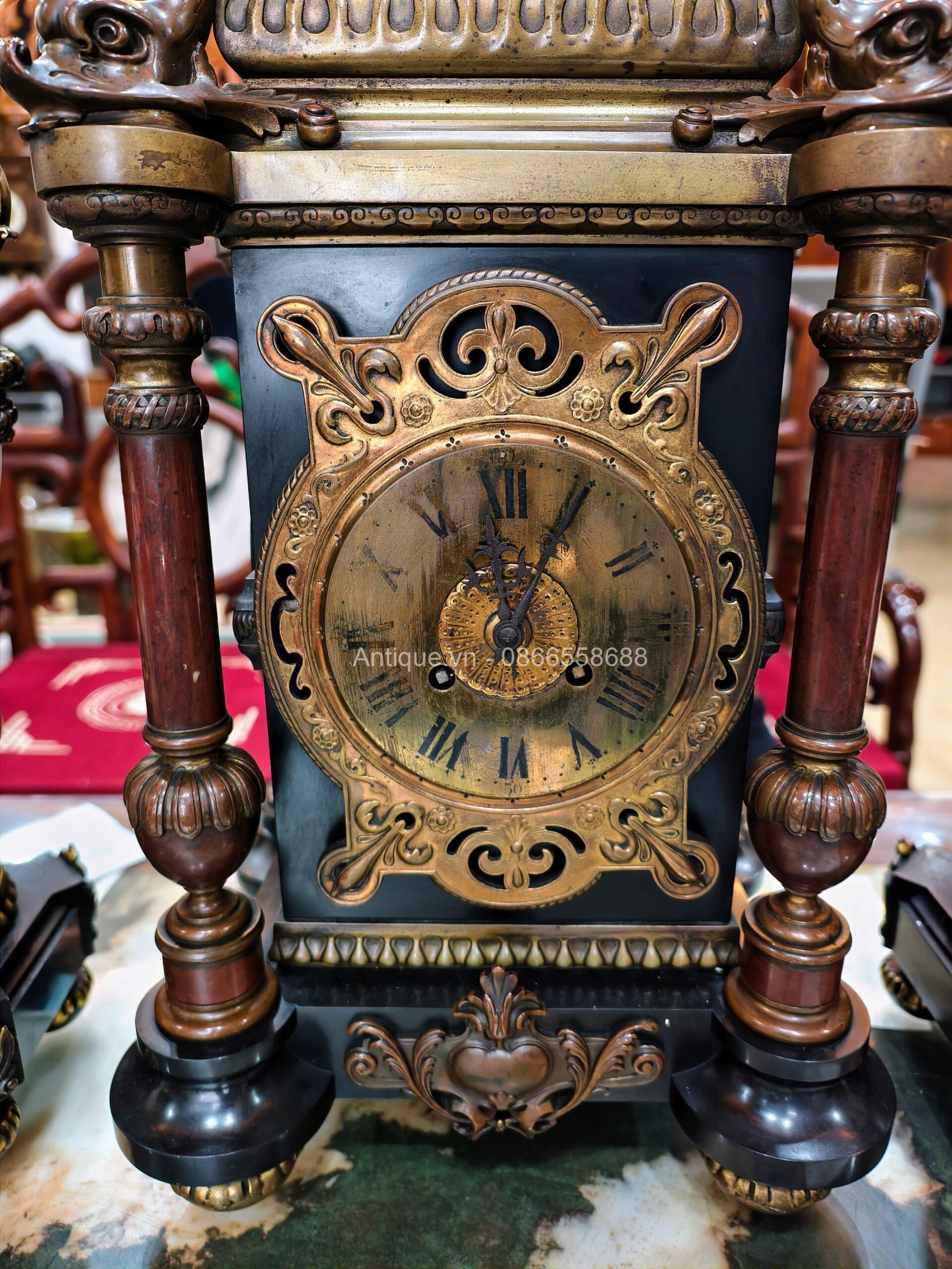 • Thiết kế: Mặt đồng hồ tròn với chữ số La Mã, được đặt trong một khung đồng trang trí họa tiết hoa văn mạ vàng nổi bật trên nền đá đen. Bốn phía là bốn cột trụ bằng đá đỏ. Đỉnh đồng hồ có biểu tượng vương miện và chi tiết trang trí điêu khắc tinh xảo.