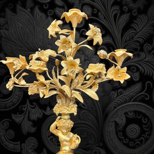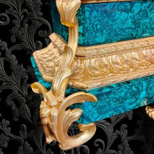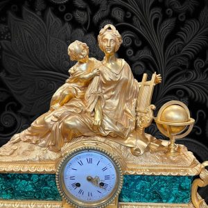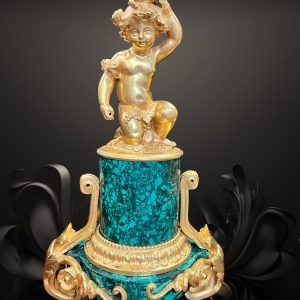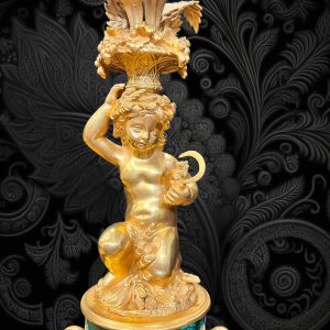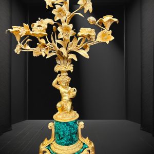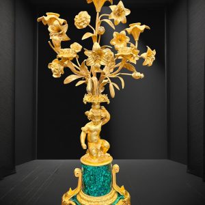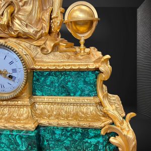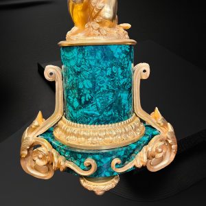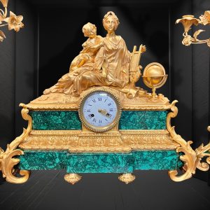 Bộ đồng hồ chân nến, xuất xứ Pháp, sự kết hợp giữa tượng đồng mạ vàng và đá Malachite sang trọng, đẳng cấp. Các chi tiết tượng và các chi tiết cực kỳ tinh xảo sắc nét.