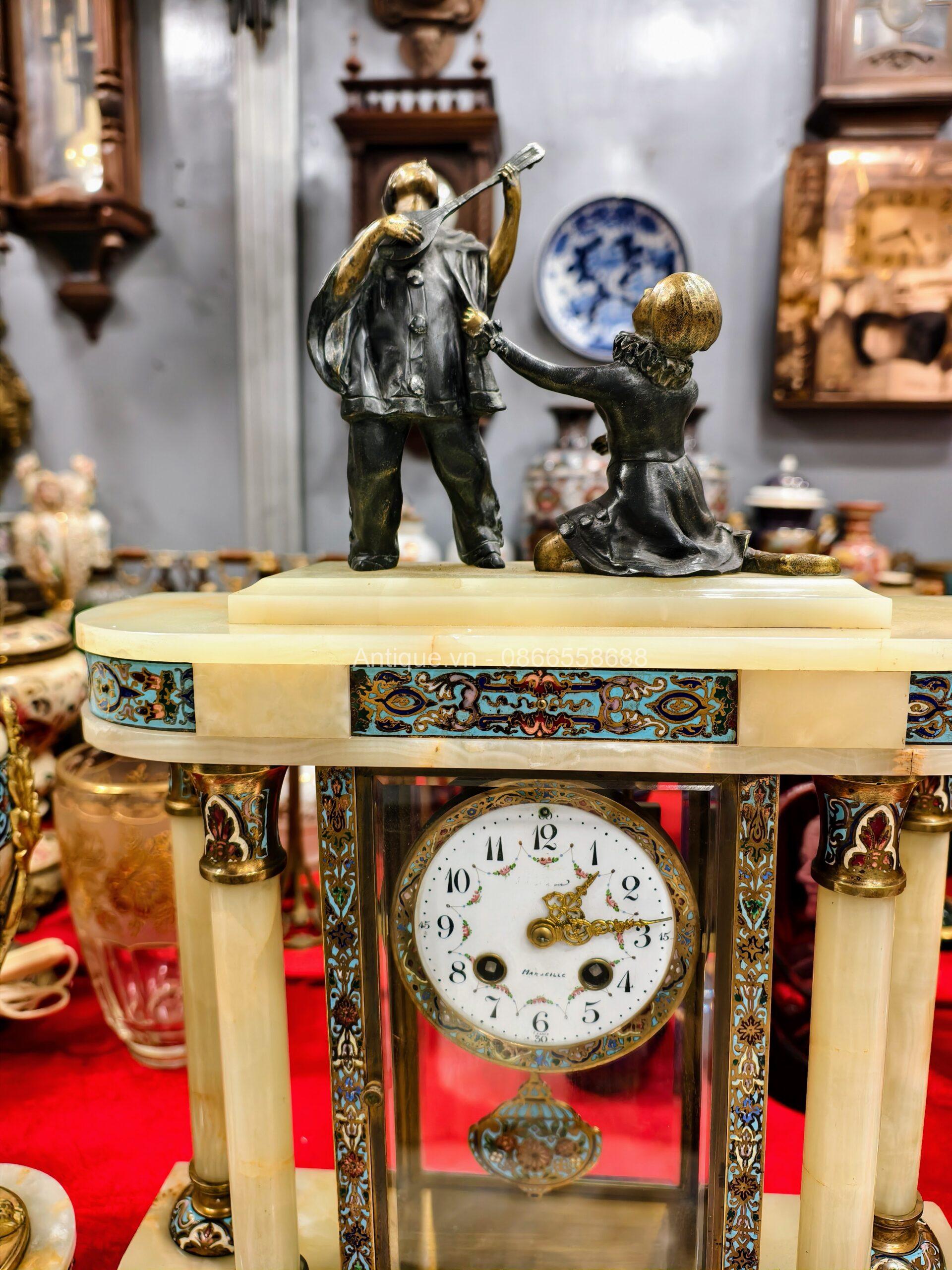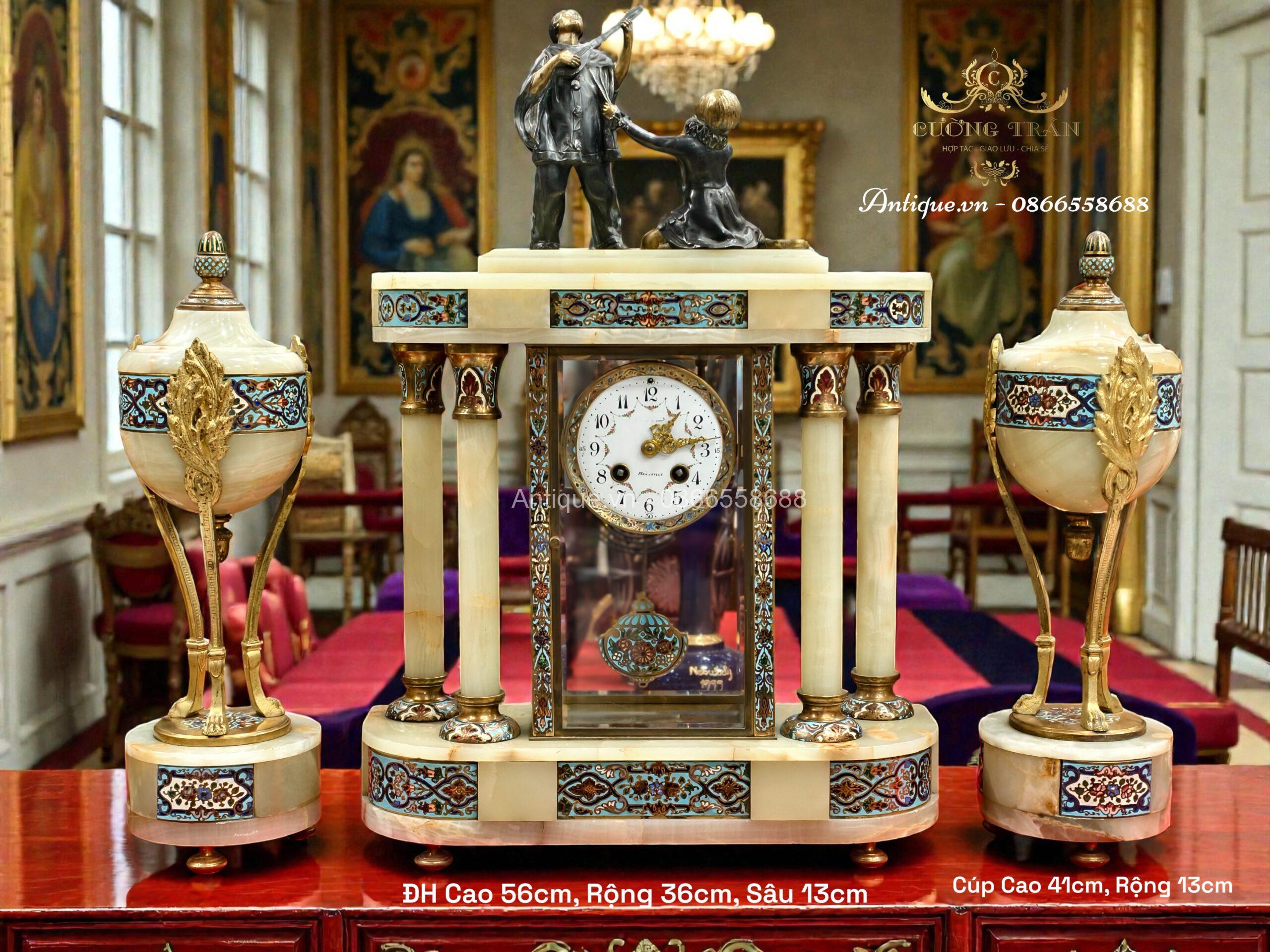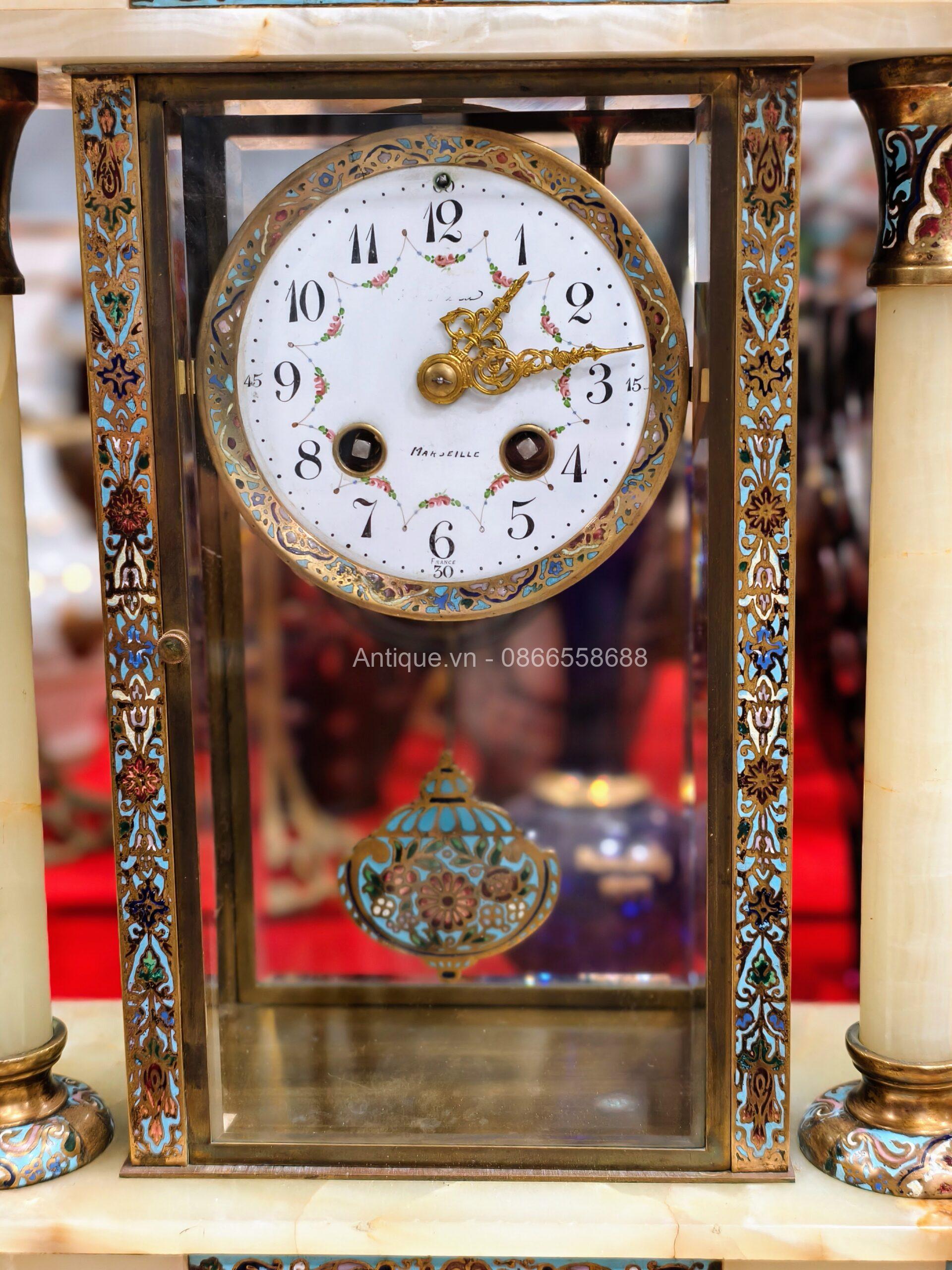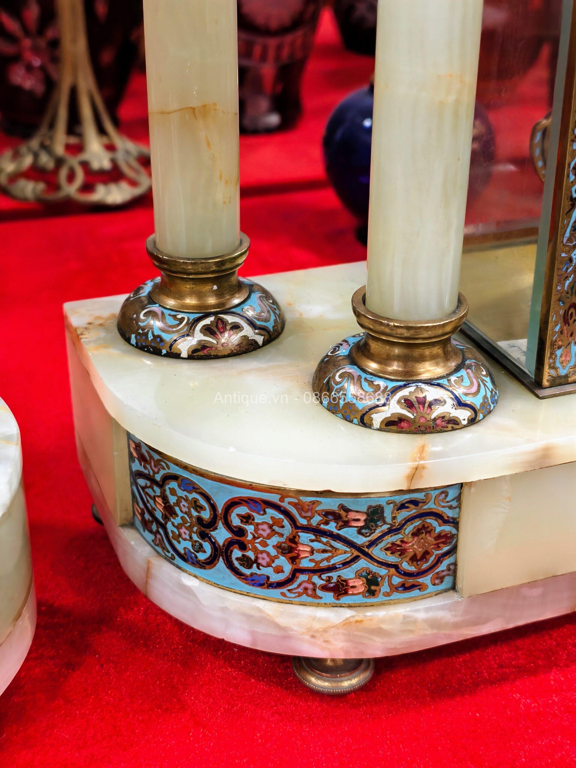 Bộ đồng hồ đá cẩm thạch, xuất xứ Pháp. Với Phần thân là sự kết hợp giữa đá cẩm thạch và các chi tiết đồng tinh xảo, được điểm thêm họa tiết pháp lam độc đáo.