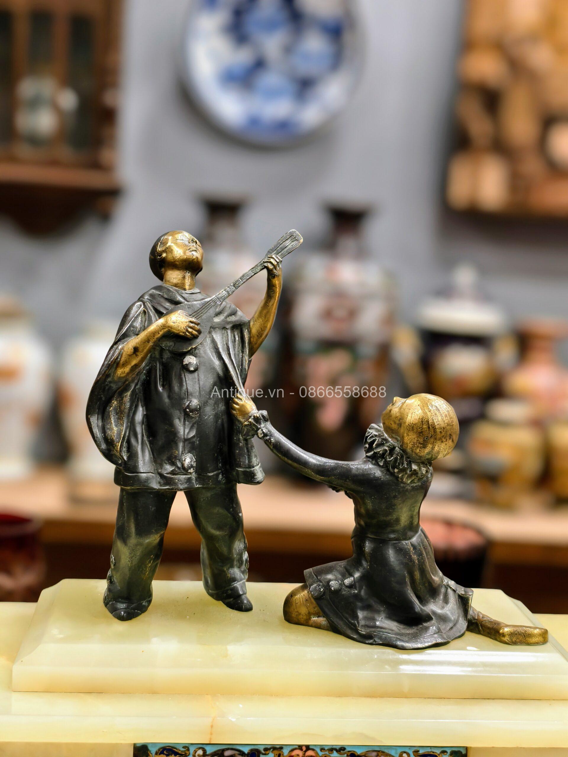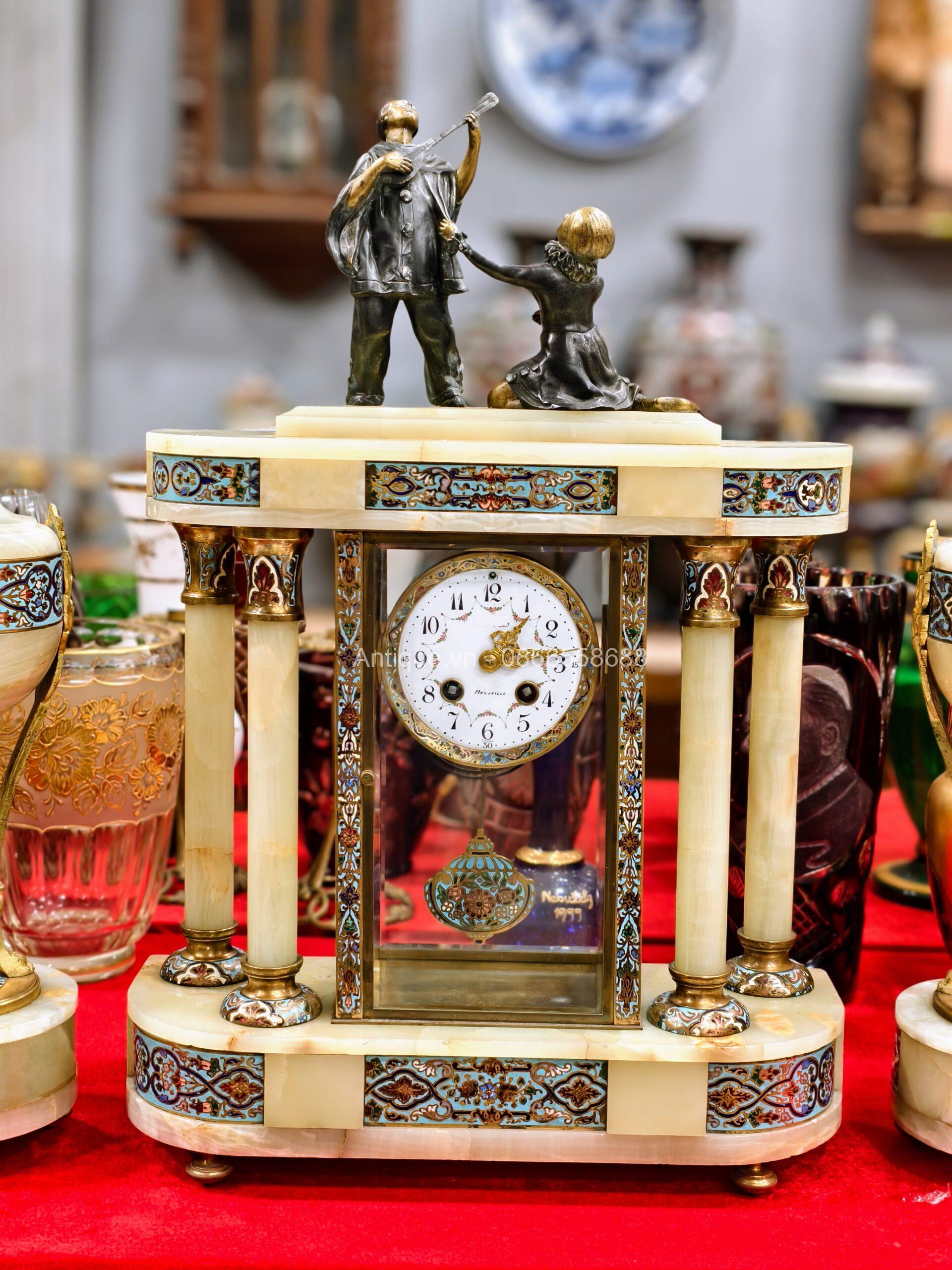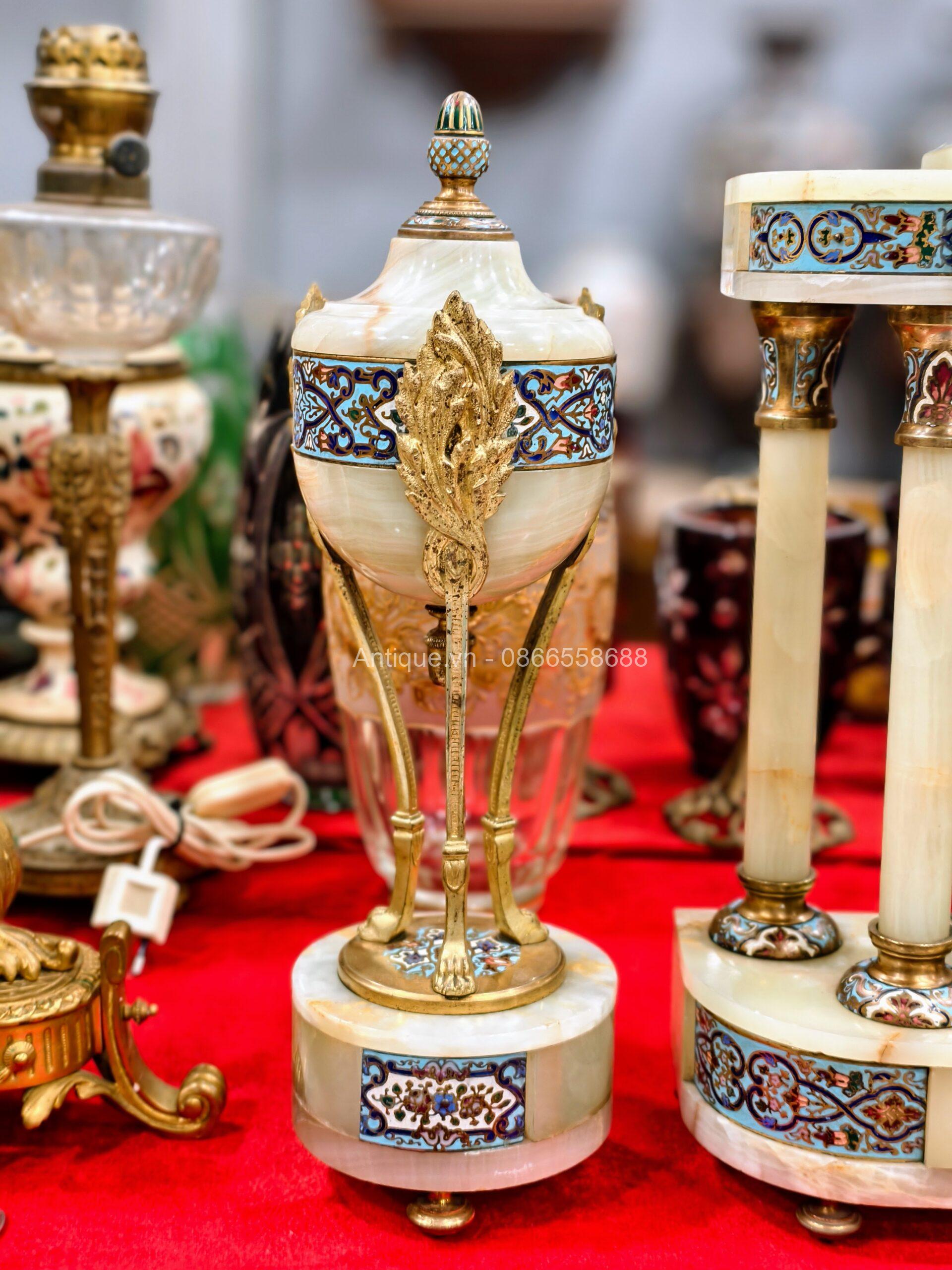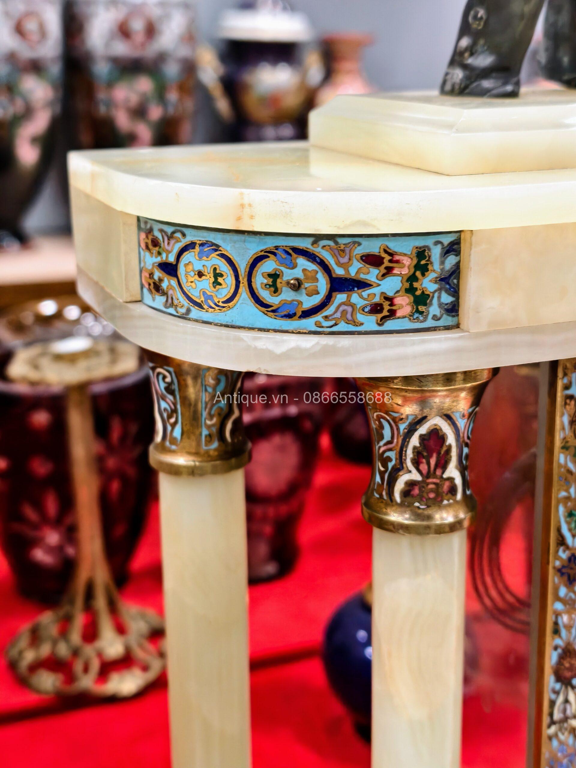 Bộ đồng hồ đá cẩm thạch, xuất xứ Pháp. Với Phần thân là sự kết hợp giữa đá cẩm thạch và các chi tiết đồng tinh xảo, được điểm thêm họa tiết pháp lam độc đáo.