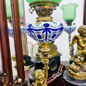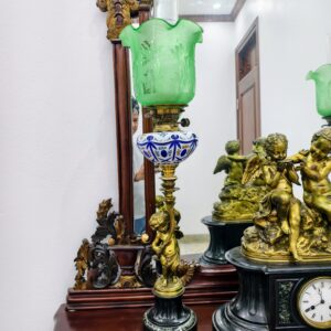 • Chất liệu: Tượng đồng đúc tinh xảo trên nền đá cẩm thạch đen quyền quý. Chao đèn thủy tinh xanh ngọc nguyên bản, vẽ hoa văn tinh tế.