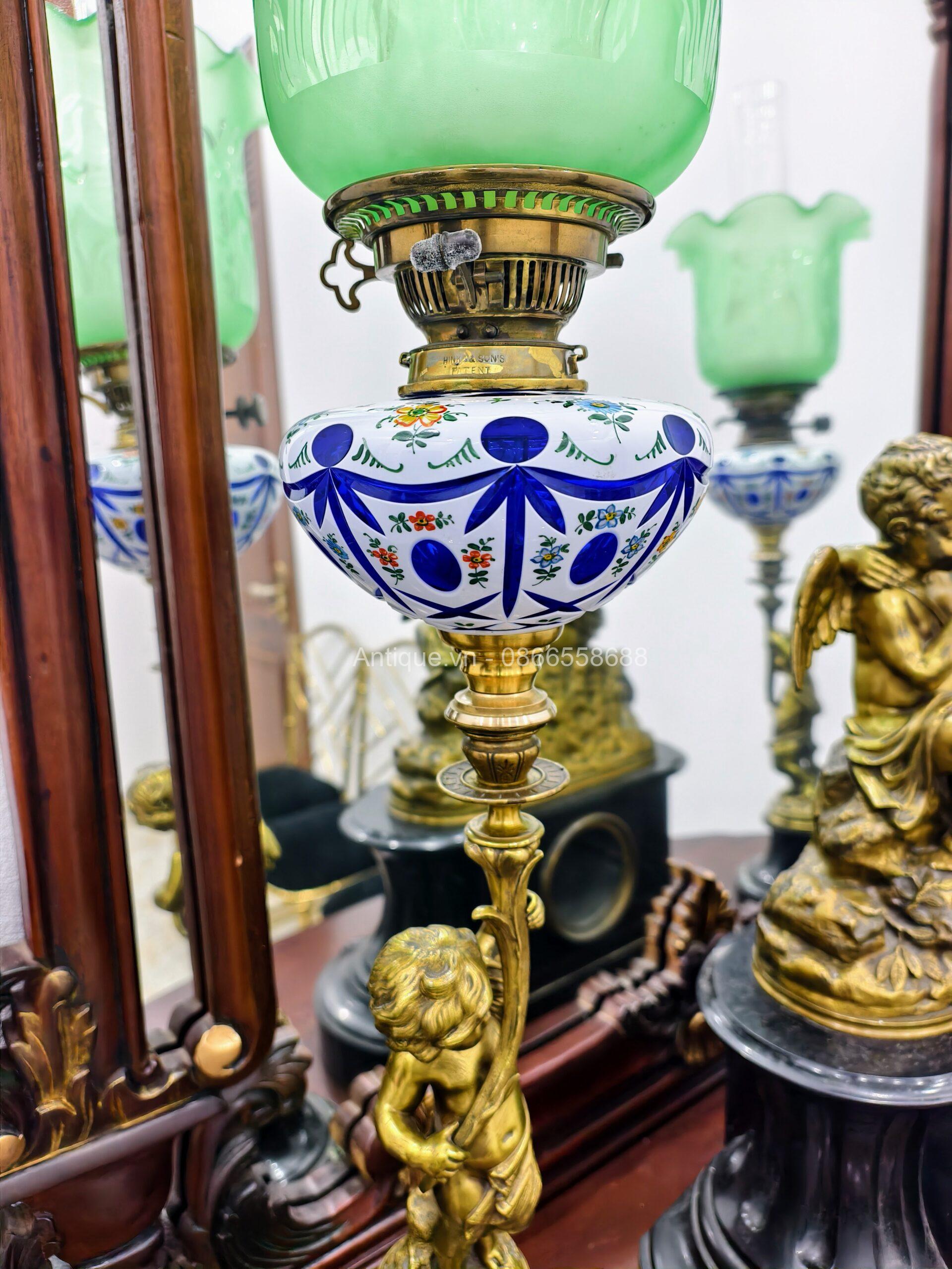 • Chất liệu: Tượng đồng đúc tinh xảo trên nền đá cẩm thạch đen quyền quý. Chao đèn thủy tinh xanh ngọc nguyên bản, vẽ hoa văn tinh tế.