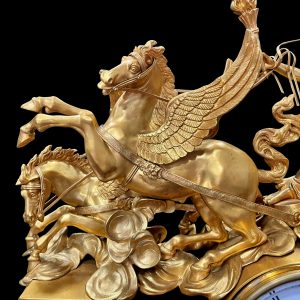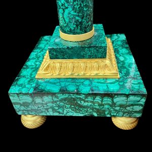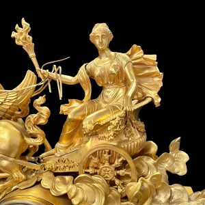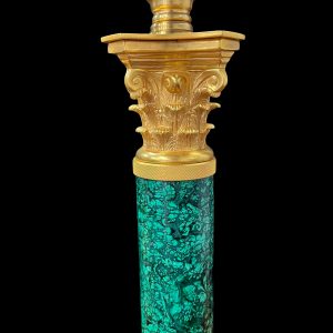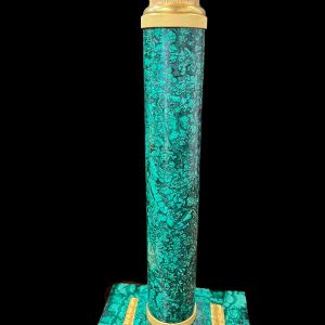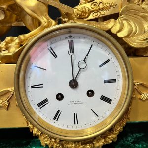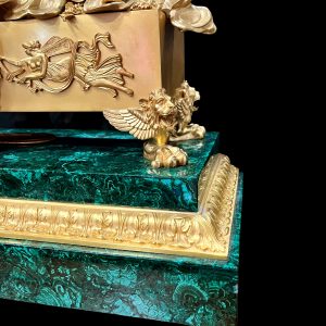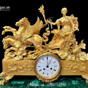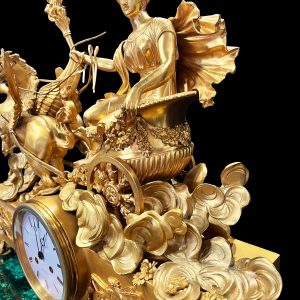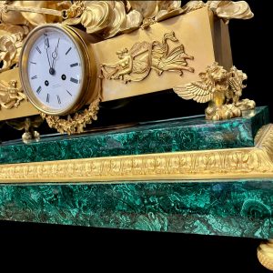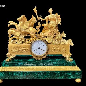 Bộ đồng hồ tượng, xuất xứ Pháp, sự kết hợp giữa tượng đồng mạ vàng và đá Malachite sang trọng, đẳng cấp. Các chi tiết của tượng cực kỳ tinh xảo sắc nét.