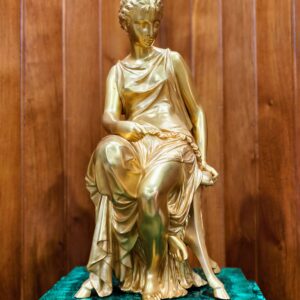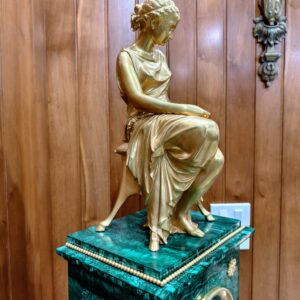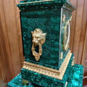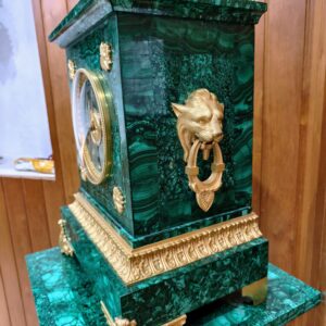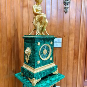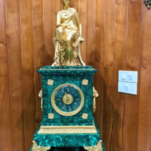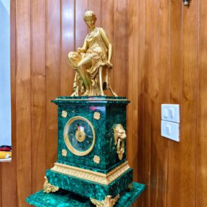 Bộ đồng hồ tượng, sự kết hợp giữa tượng đồng mạ vàng và đá Malachite sang trọng, đẳng cấp. Các chi tiết của tượng cực kỳ tinh xảo sắc nét.