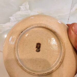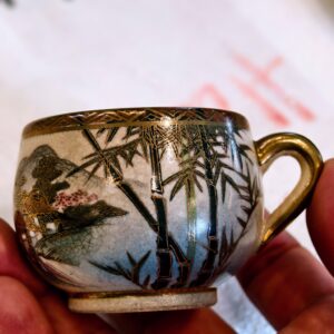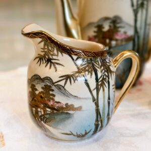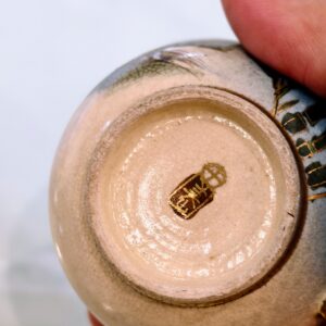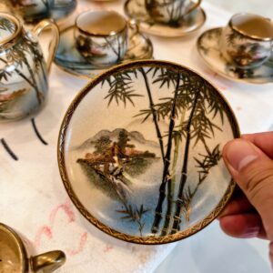 Bộ ấm trà Satsuma Nhật, với đặc trưng của dấu triện trên chén đĩa, bên dưới gia hiệu Shimazu là chữ viết Kyokuzan được vẽ tay bằng vàng.