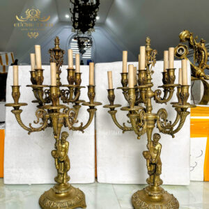 Cặp chân nến điện đồng cổ, xuất xứ Pháp. Toàn thân bằng đồng đúc, phần thân là tượng thân người phần chân dê, họa tiết rất đẹp và sắc nét.