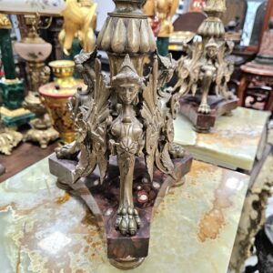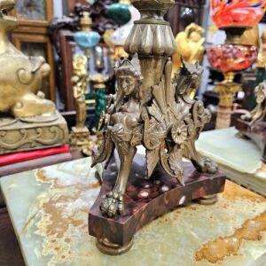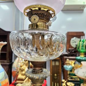Cặp đèn dầu, thân đèn bằng đồng với phần đế là 3 pho tượng nhỏ, phần chân móng sư tử đứng trên đế đá cẩm thạch đỏ rất đẹp. Bầu đèn pha lê trắng mài móng tay rất đẹp.
