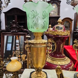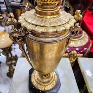 Cặp đèn dầu, sự kết hợp tinh tế giữa đế đá với các chi tiết đồng tỉ mỉ, sắc nét, mang lại vẻ đẹp sang trọng.