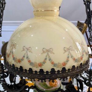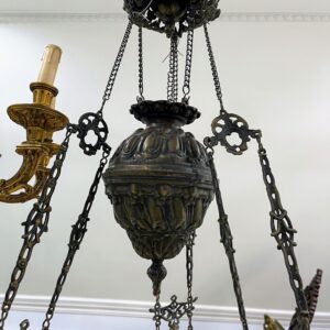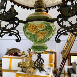 Đèn 3 dây, xuất xứ Pháp. Thân đèn kết hợp giữa bầu sứ và các họa tiết thuyền buồm bằng đồng tinh xảo, tượng trưng cho thuận buồm xuôi gió.