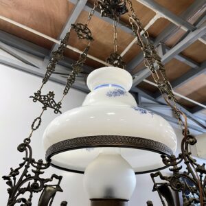 Đèn 3 dây điện, bầu sứ, các chi tiết khung và dây bằng đồng. Với họa tiết chính là thuyền buồm, tượng trưng cho may mắn, mọi việc đều thuận buồm xuôi gió. Thích hợp treo nhà cổ.