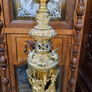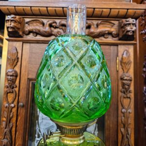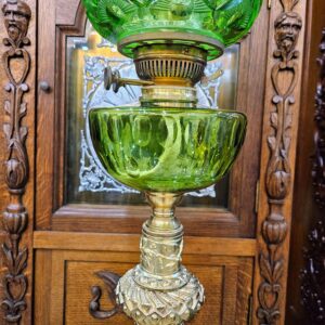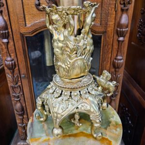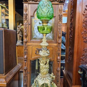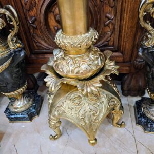 Đèn cây, xuất xứ Pháp. Toàn thân bằng đồng, với các chi tiết được đúc cực kỳ sắc nét và tinh xảo. Bầu và lam đèn bằng pha lê mài, họng duplex.