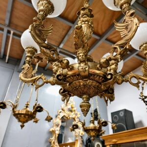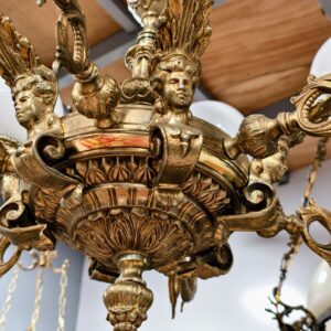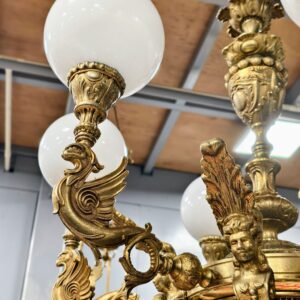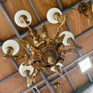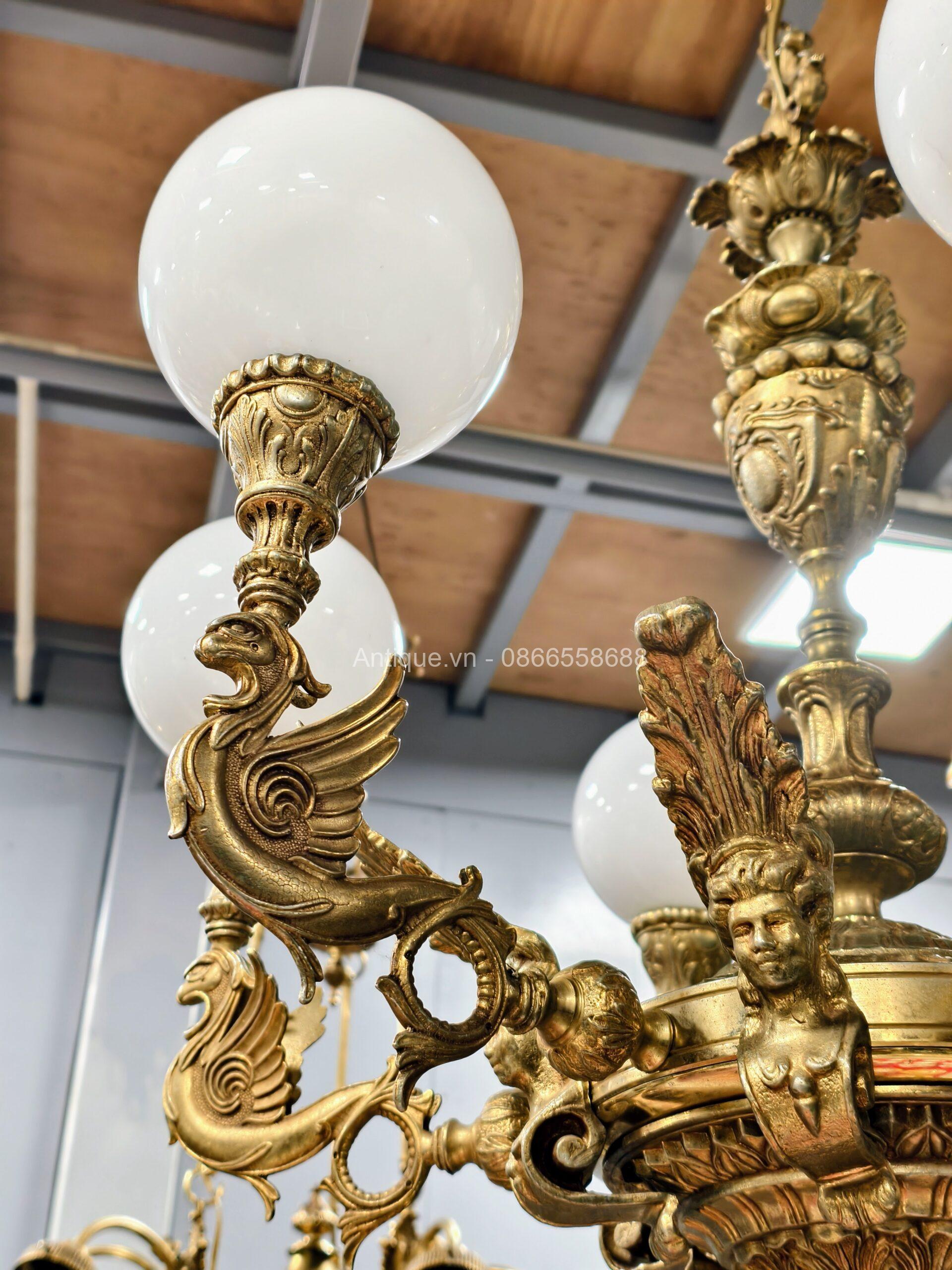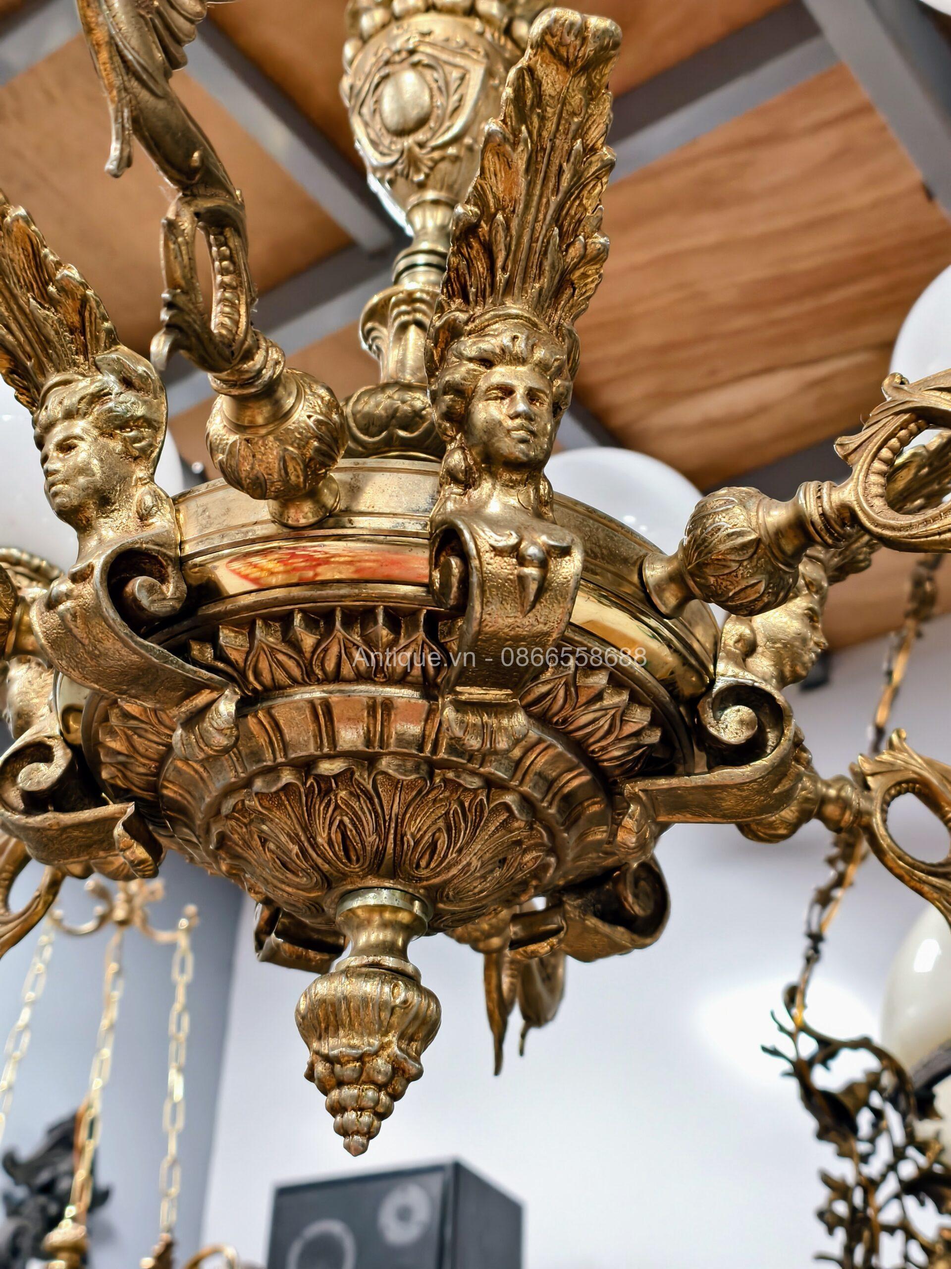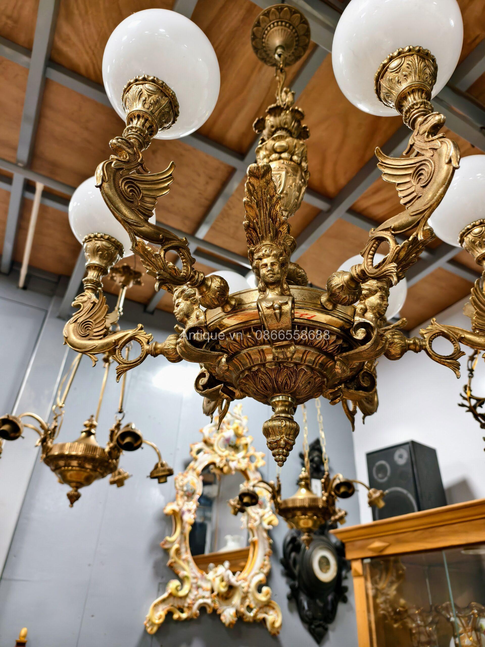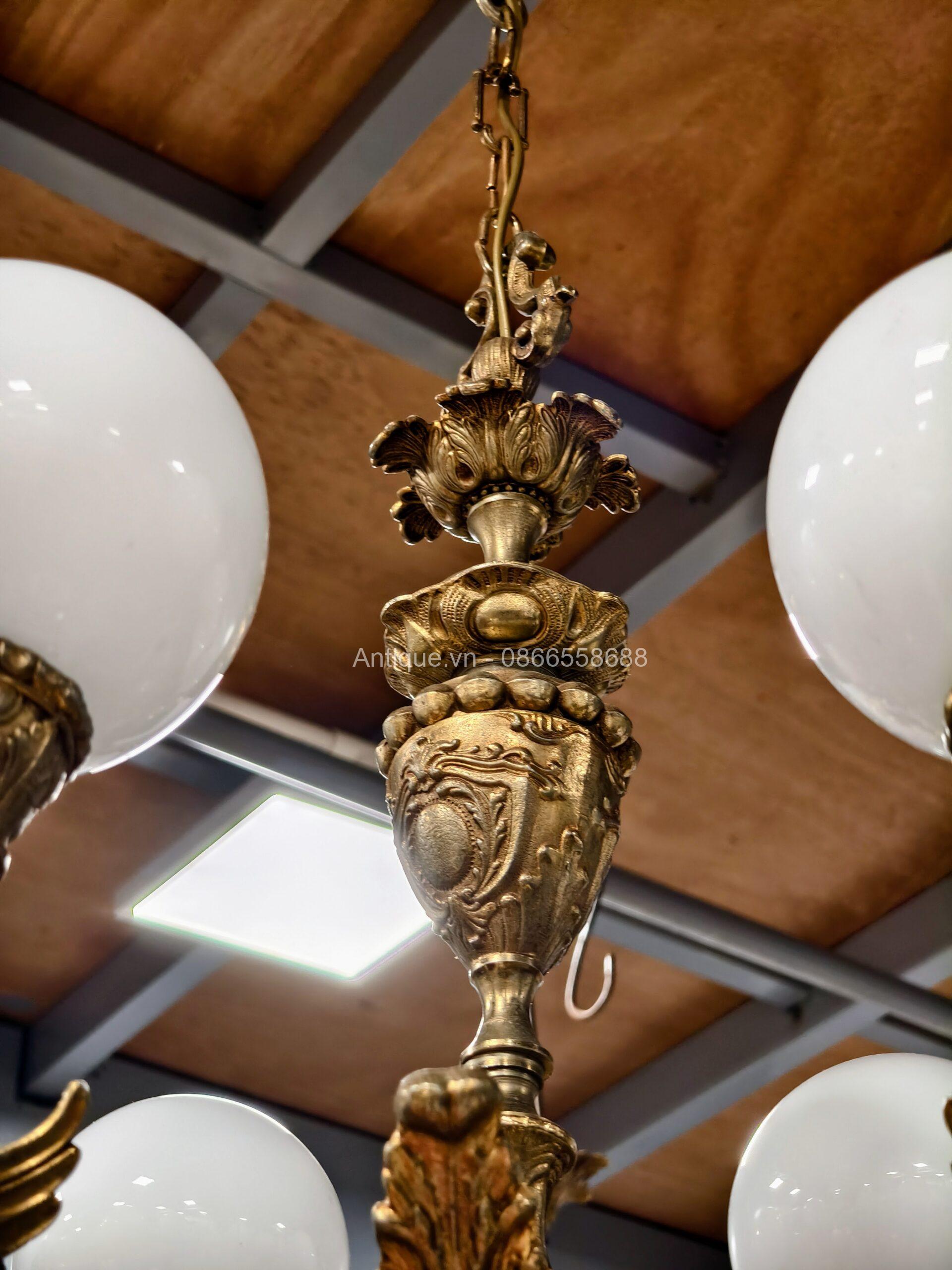 Một chiếc đèn chùm cổ điển bằng đồng với sau tay 6 bóng, mỗi bóng là một lam đèn hình cầu trắng.