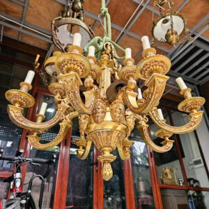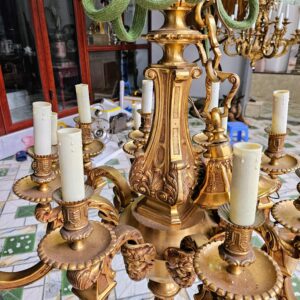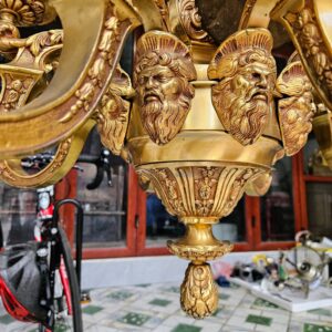 Đèn chùm Pháp, toàn thân bằng đồng đúc, với các chi tiết đồng được chế tác tinh xảo. Đèn 8 tay 16 ngọn nến, dưới mỗi tay là một mặt người.
