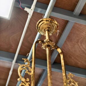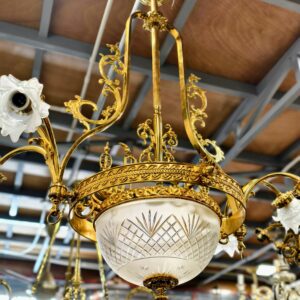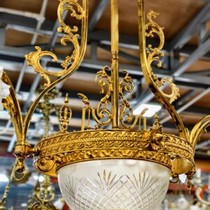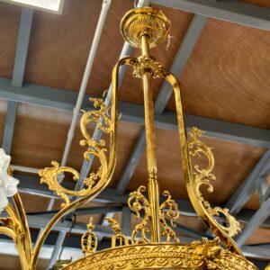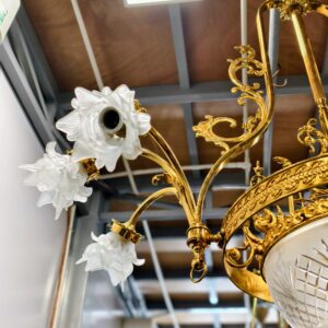 Đèn chùm Pháp, toàn thân bằng đồng đúc lacke vàng, với các chi tiết cực kỳ sắc nét. Đèn 6 ngọn nhỏ và 1 bóng lớn chính giữa. Chao chính đèn cực kỳ đẹp và dày dặn.