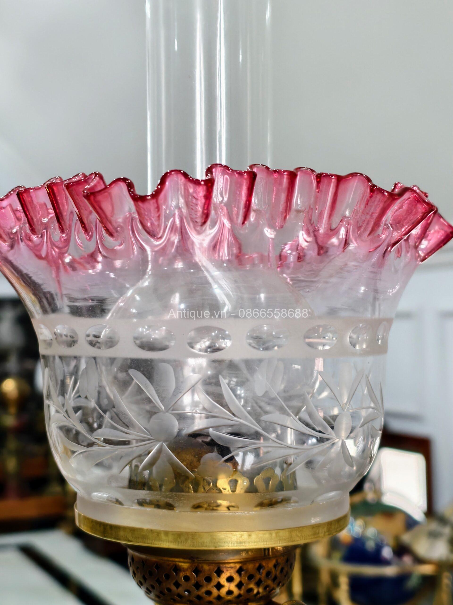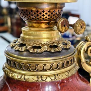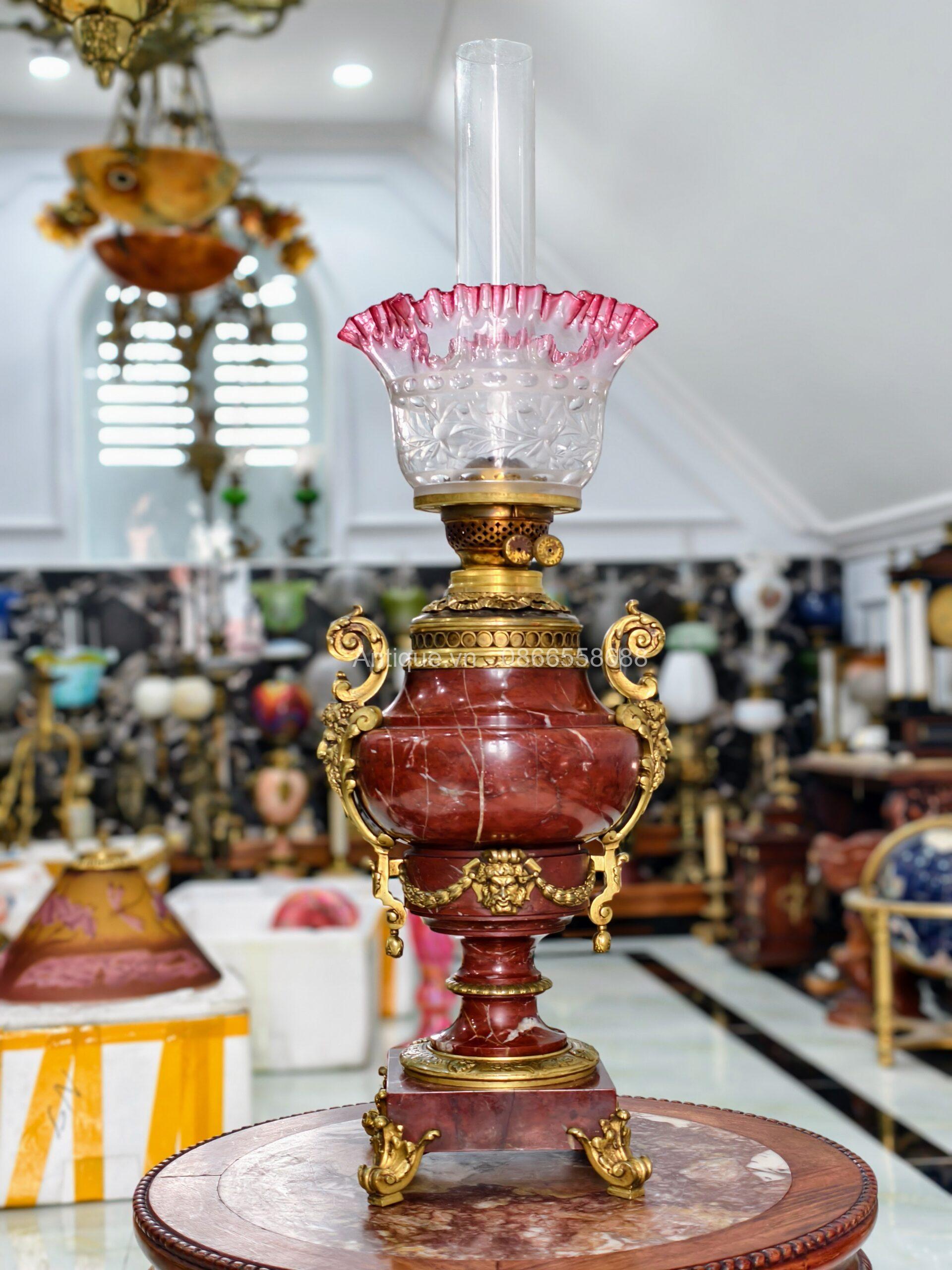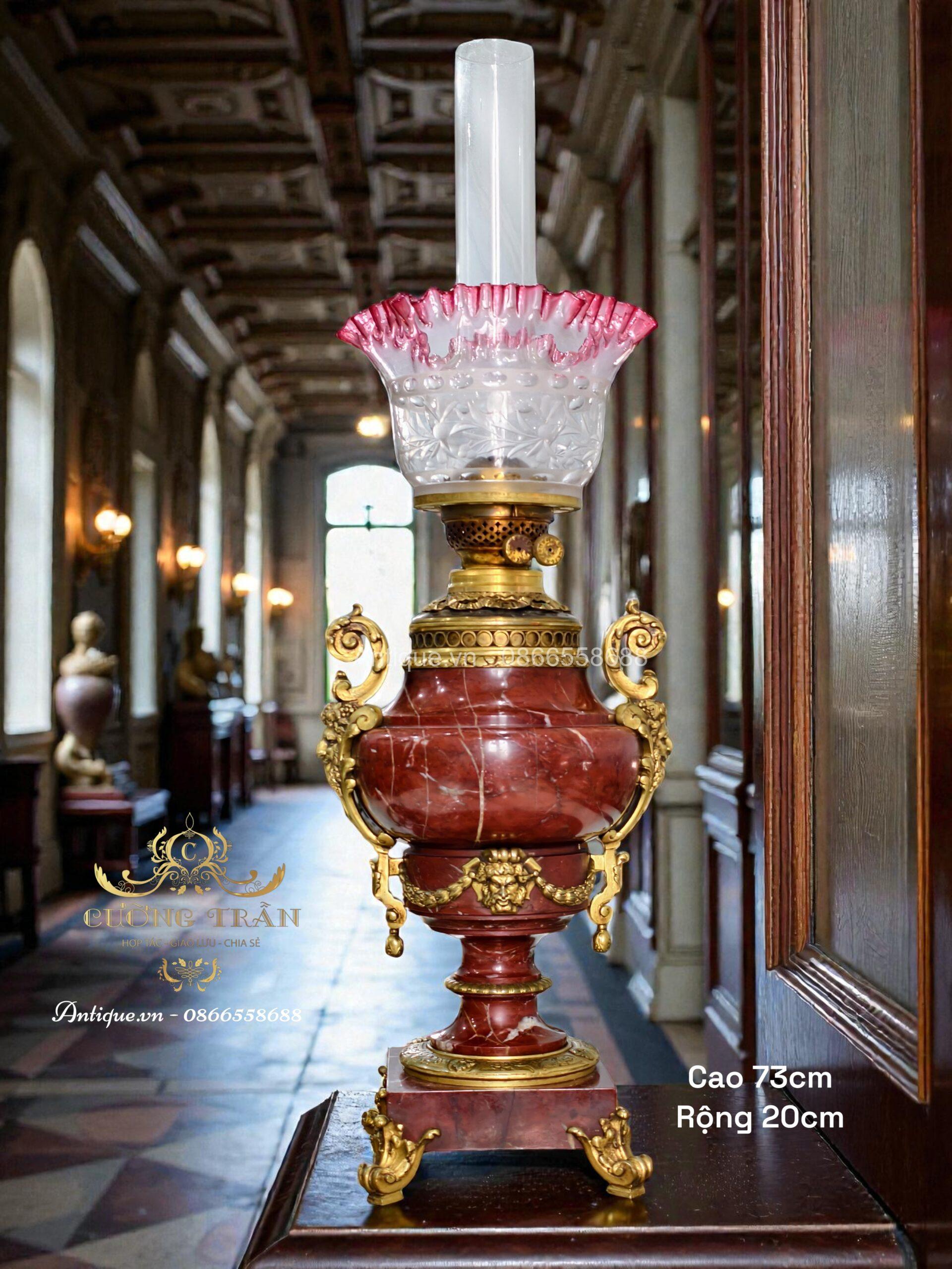 Đèn dầu Pháp, thân đèn bằng đá đỏ rất đẹp, kết hợp với các chi tiết đồng tinh xảo.
