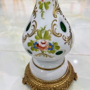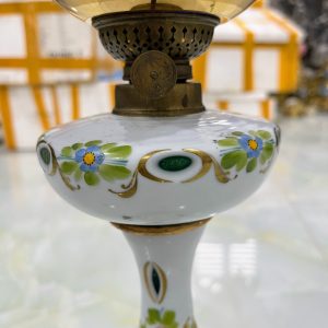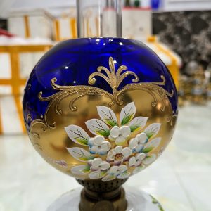 Đèn dầu pha lê, xuất xứ Séc. Toàn thân bằng pha lê 2 da được mài họa tiết thủ công kết hợp họa tiết vẽ tay rất đẹp. Lam pha lê hoa vẽ vàng.