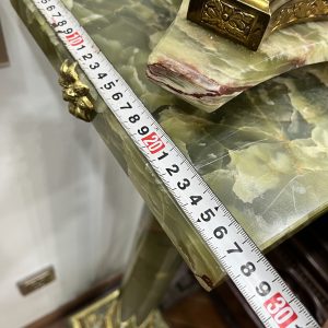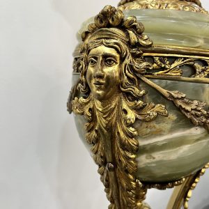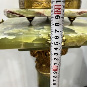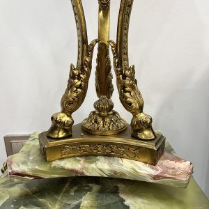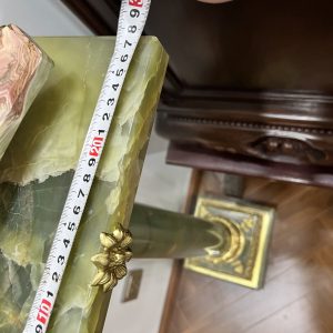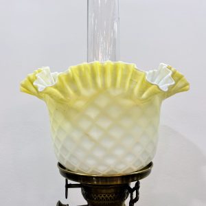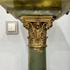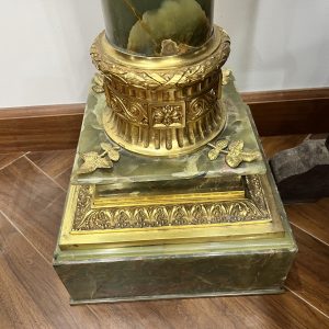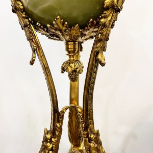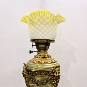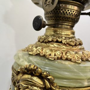 Một chiếc đèn dầu Pháp, toàn bộ thân đèn và đôn bằng đá cẩm thạch kết hợp với các chi tiết đồng cực kỳ đẹp và sắc nét. Lam pha lê cổ, họng đủ nâng hạ lam và dập lửa.