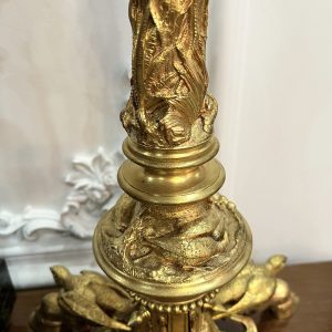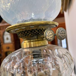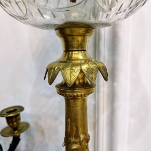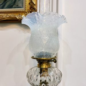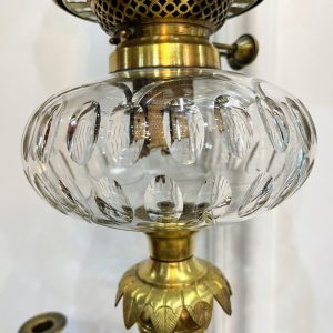 Đèn dầu Pháp, thân đèn bằng đồng đúc với họa tiết cò bắt cá trên thân chân chim và móng dê độc đáo. Bầu pha lê mài móng tay, họng duplex lam pha lê cổ.