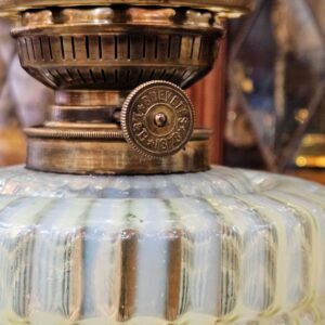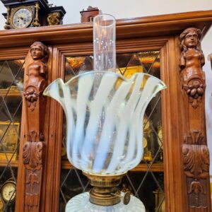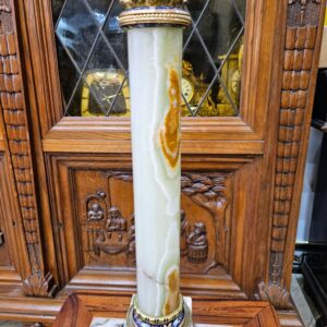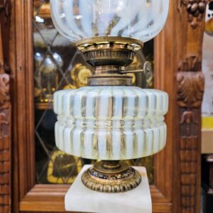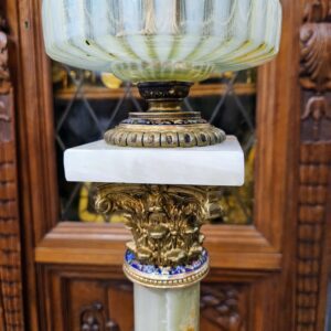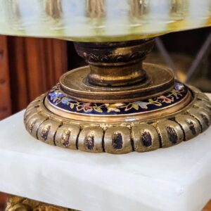 Đèn dầu Pháp, thân đèn bằng đá cẩm thạch, kết hợp các chi tiết đồng được điểm thêm pháp lam điểm cực kỳ đẹp và tinh tế.
