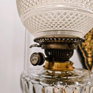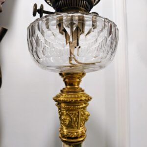 Đèn dầu Pháp, thân đèn bằng đá cẩm thạch, kết hợp các chi tiết đồng cực kỳ đẹp và tinh xảo. Bầu pha lê mài móng 5 tầng, họng duplex.