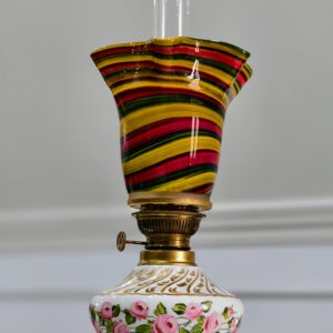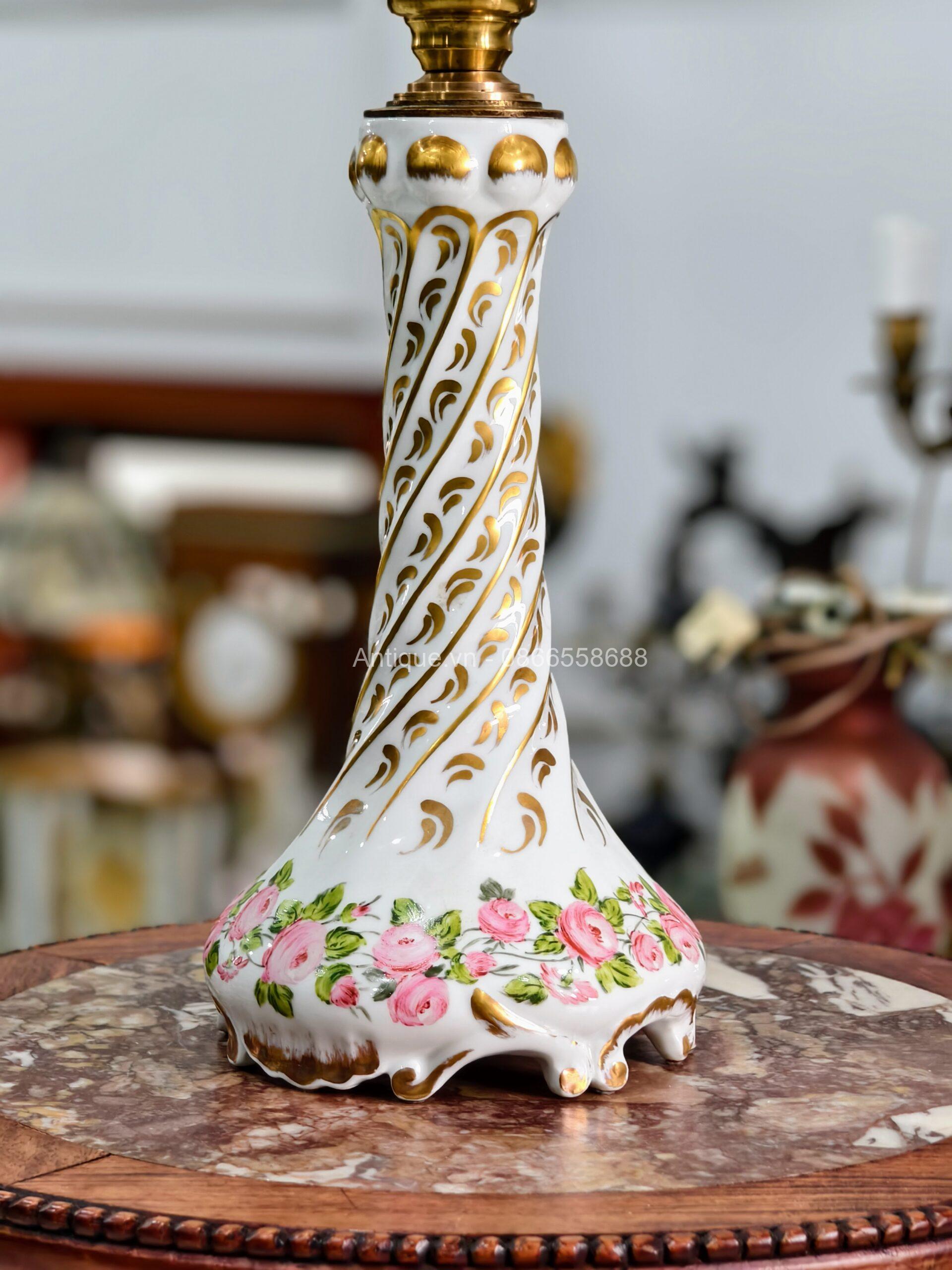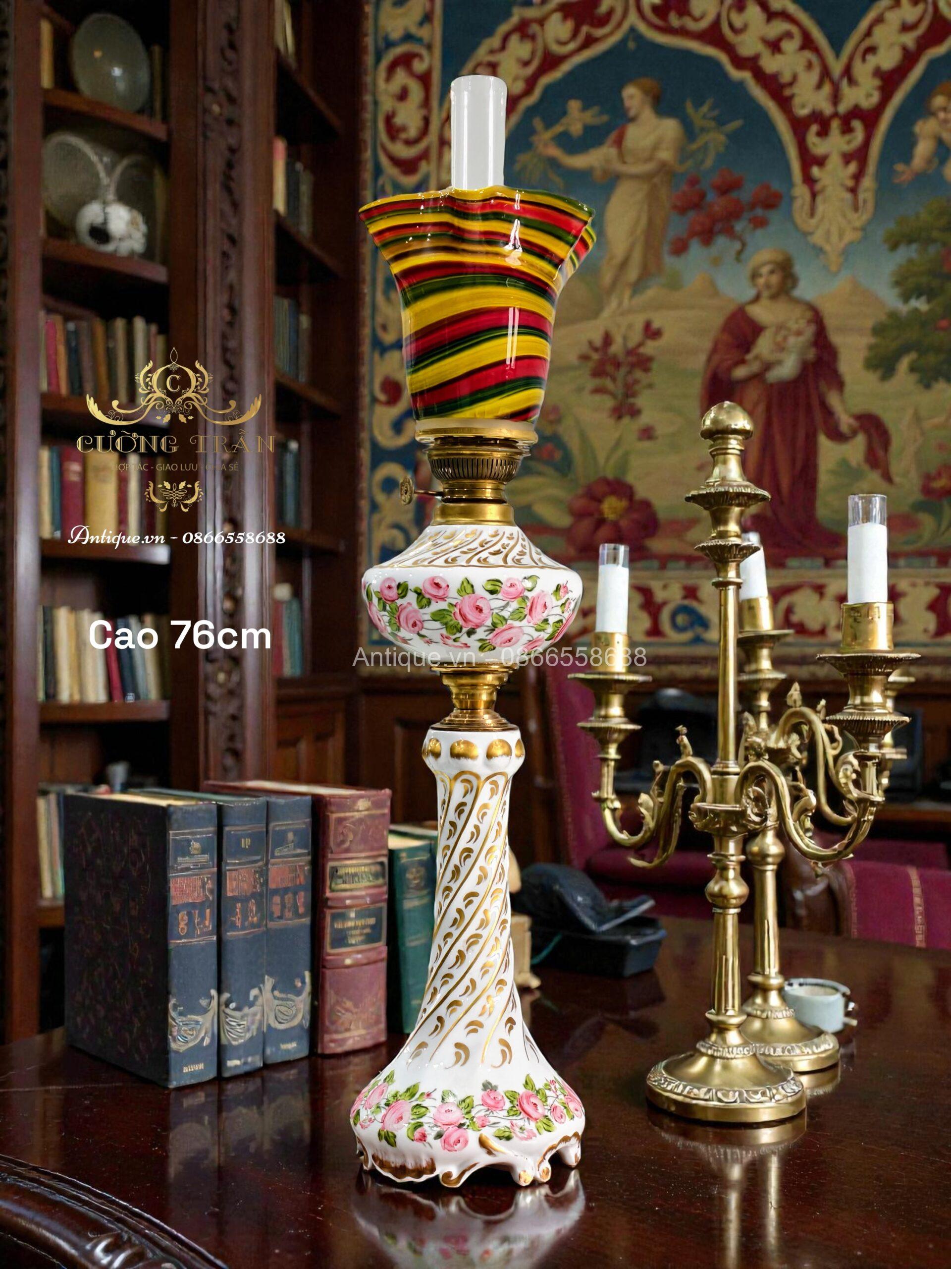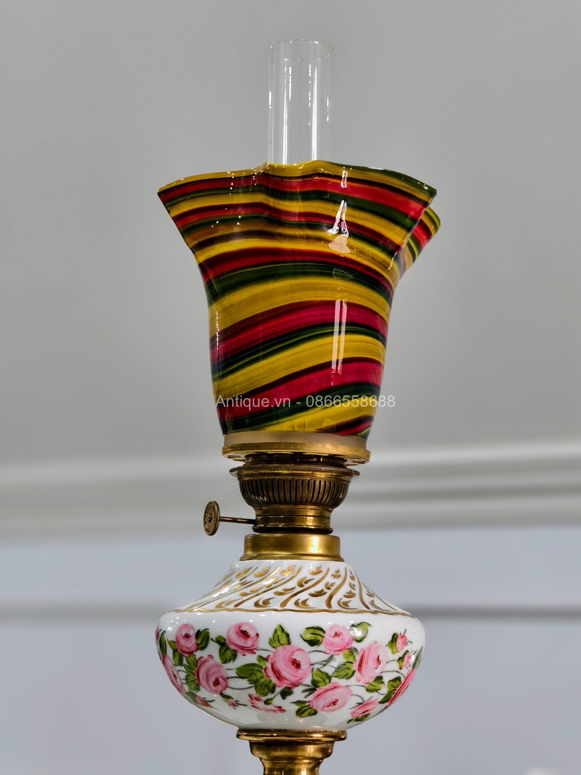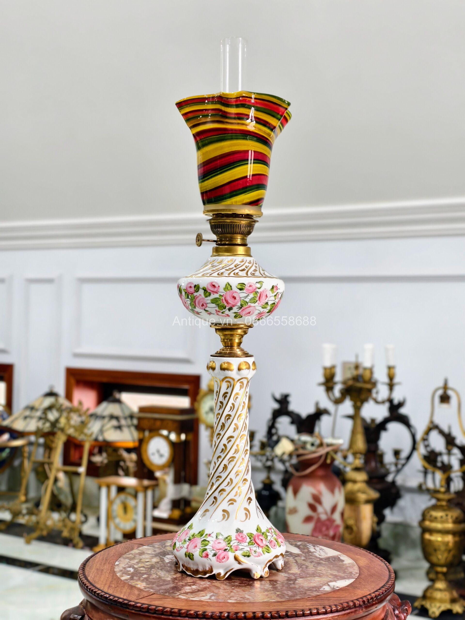 Đèn dầu Pháp, toàn thân đèn bằng sứ, được sản xuất tại vùng Limoges, Pháp, thủ phủ của ngành công nghiệp sứ cao cấp thế giới. Nhà sản xuất A. Giraud & Cie đã vẽ và hoàn thiện tác phẩm này.