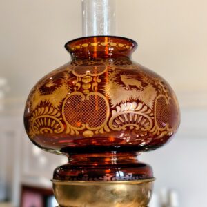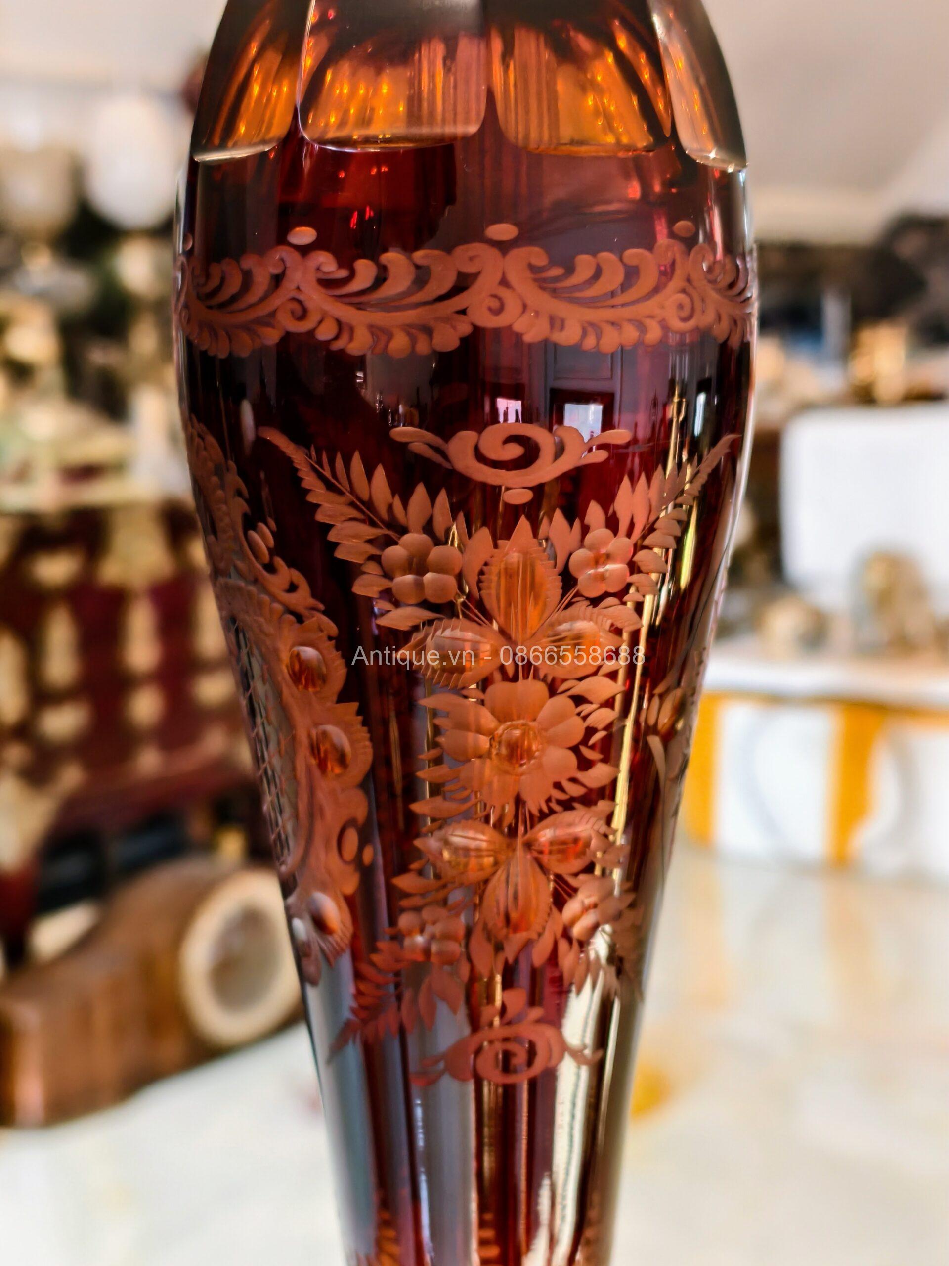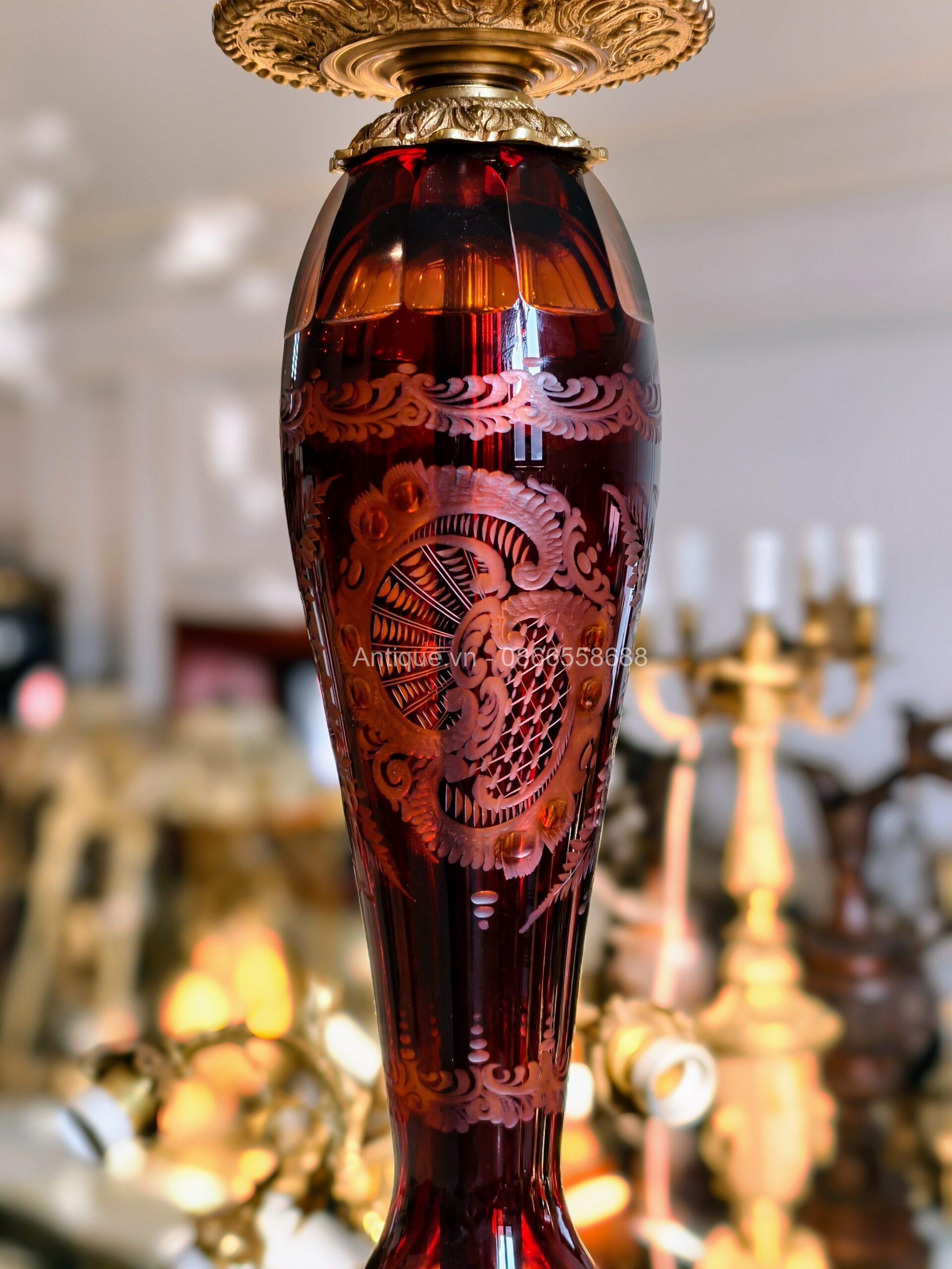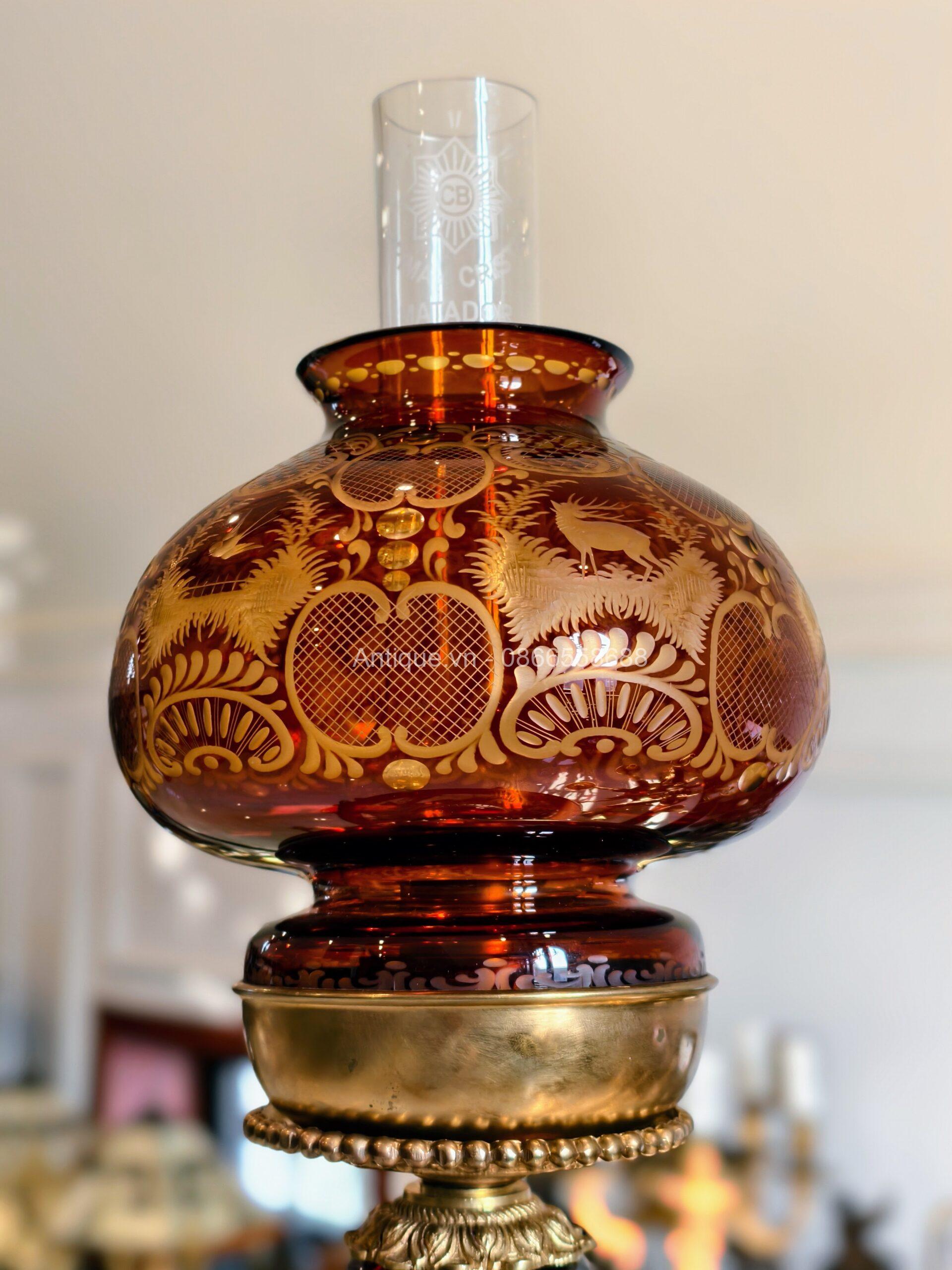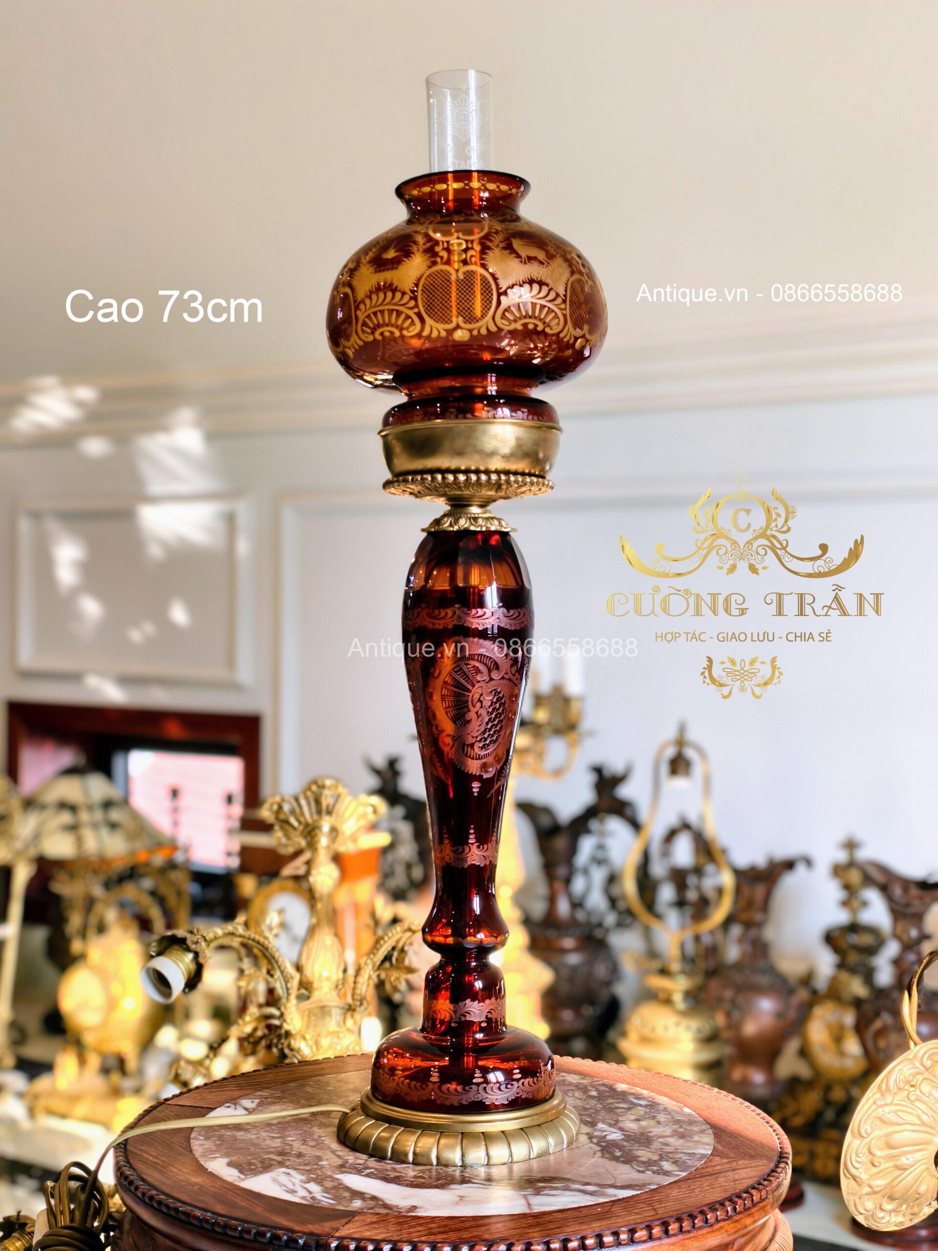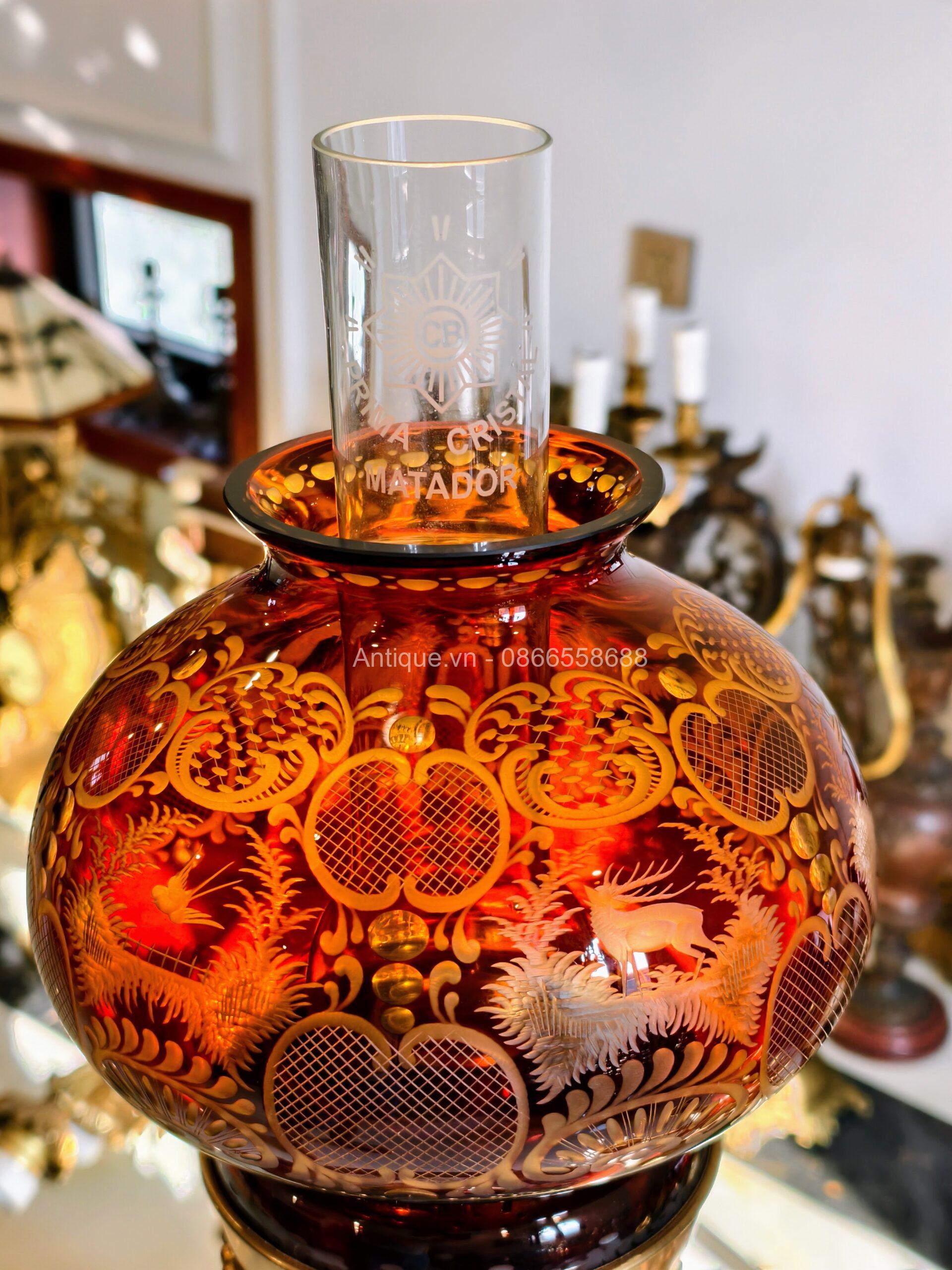 Đèn pha lê điện, toàn thân bằng pha lê các họa tiết, chim, tuần lộc và hoa lá được mài thủ công cực kỳ tinh xảo, kết hợp một số chi tiết bằng đồng.