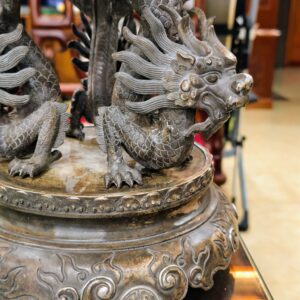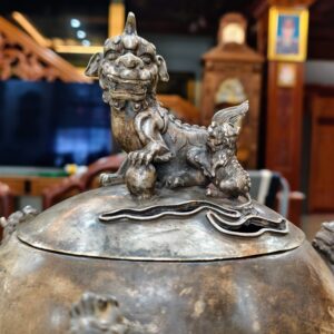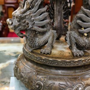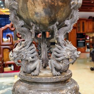 Một chiếc lư xông trầm bằng đồng, bầu đỉnh có hình dạng quả cầu, được chạm khắc năm con lân vờn quanh. Chân đế là được chạm khắc hình rồng làm chân đỡ cho quả cầu chính.