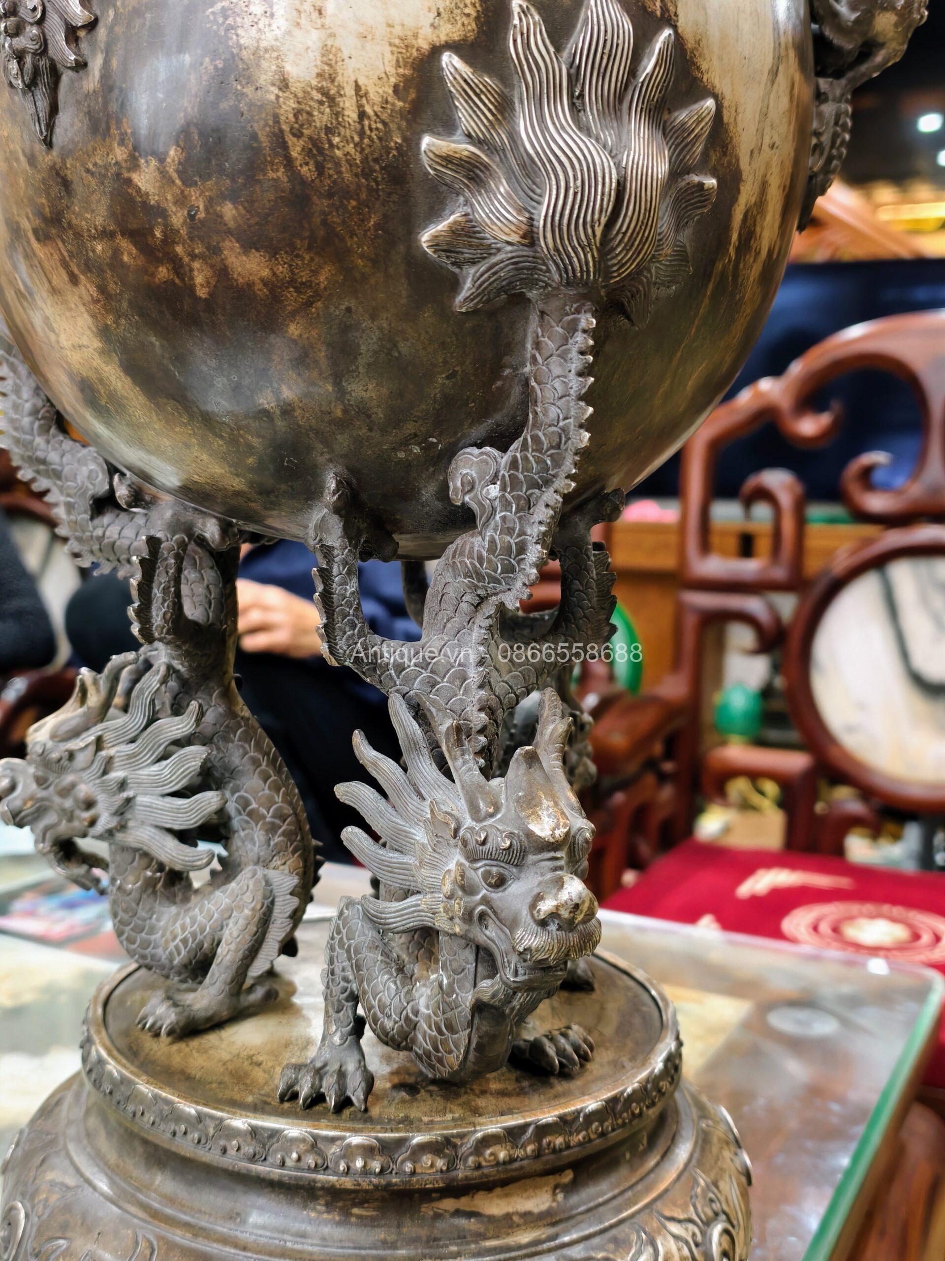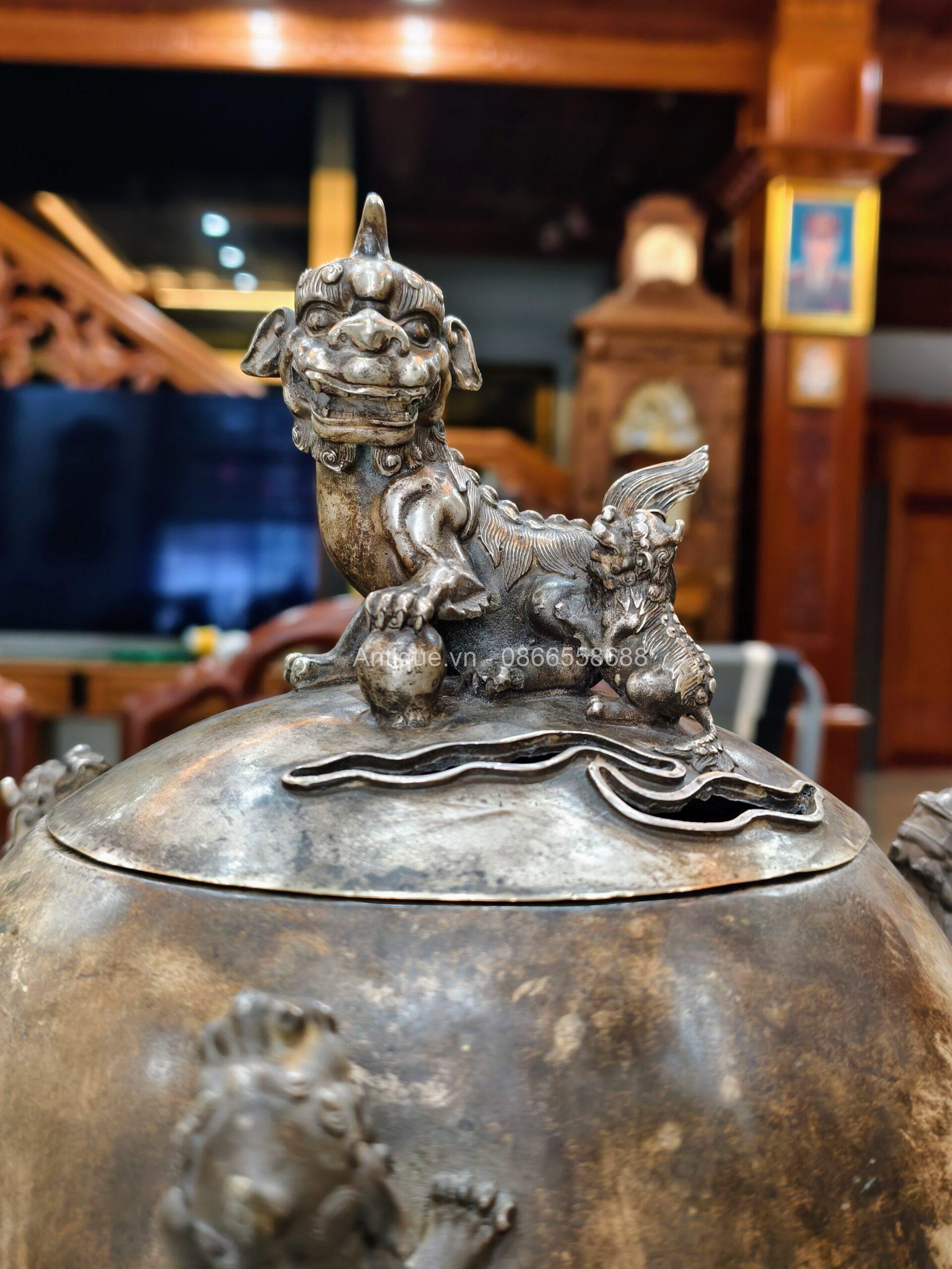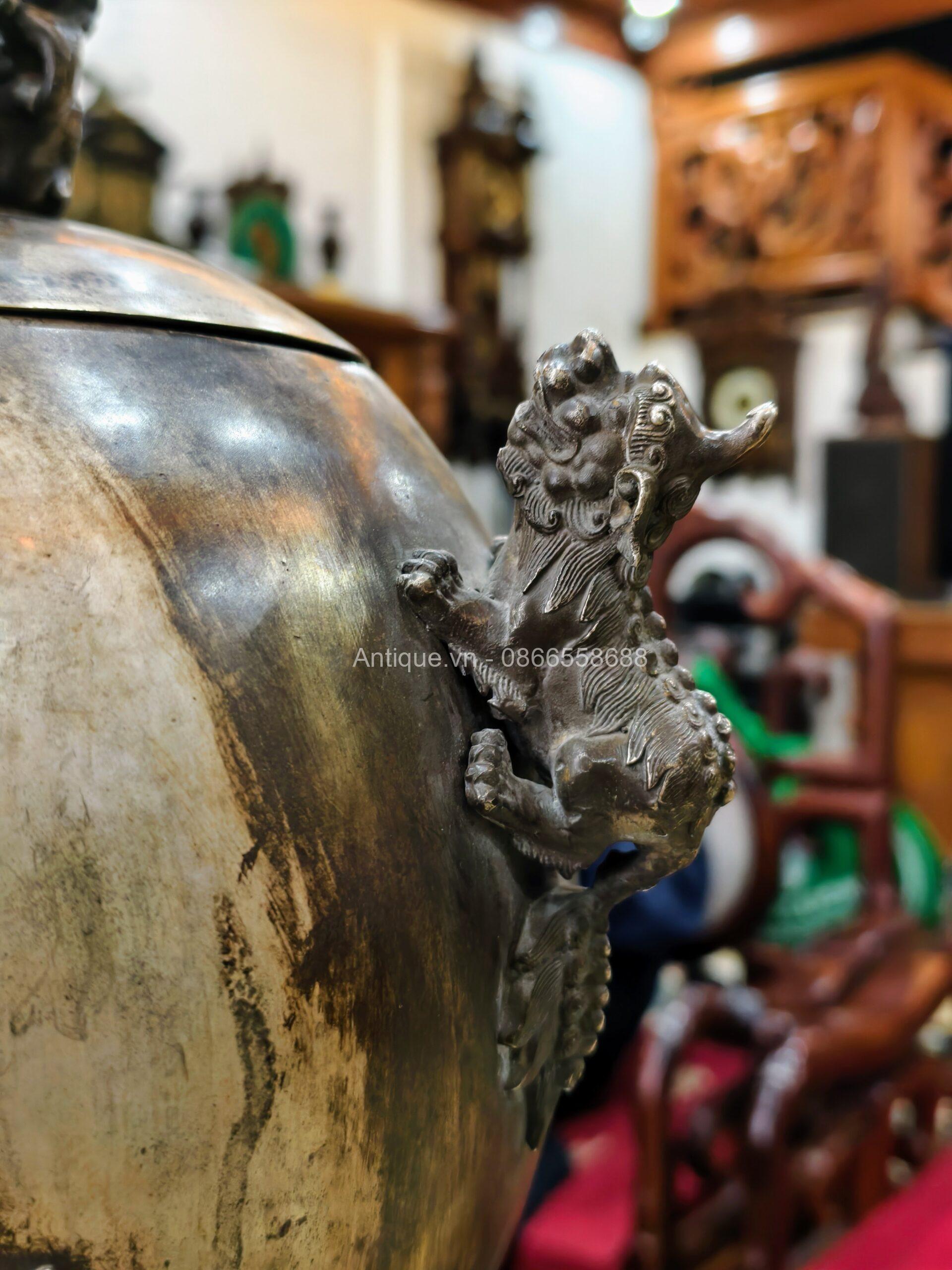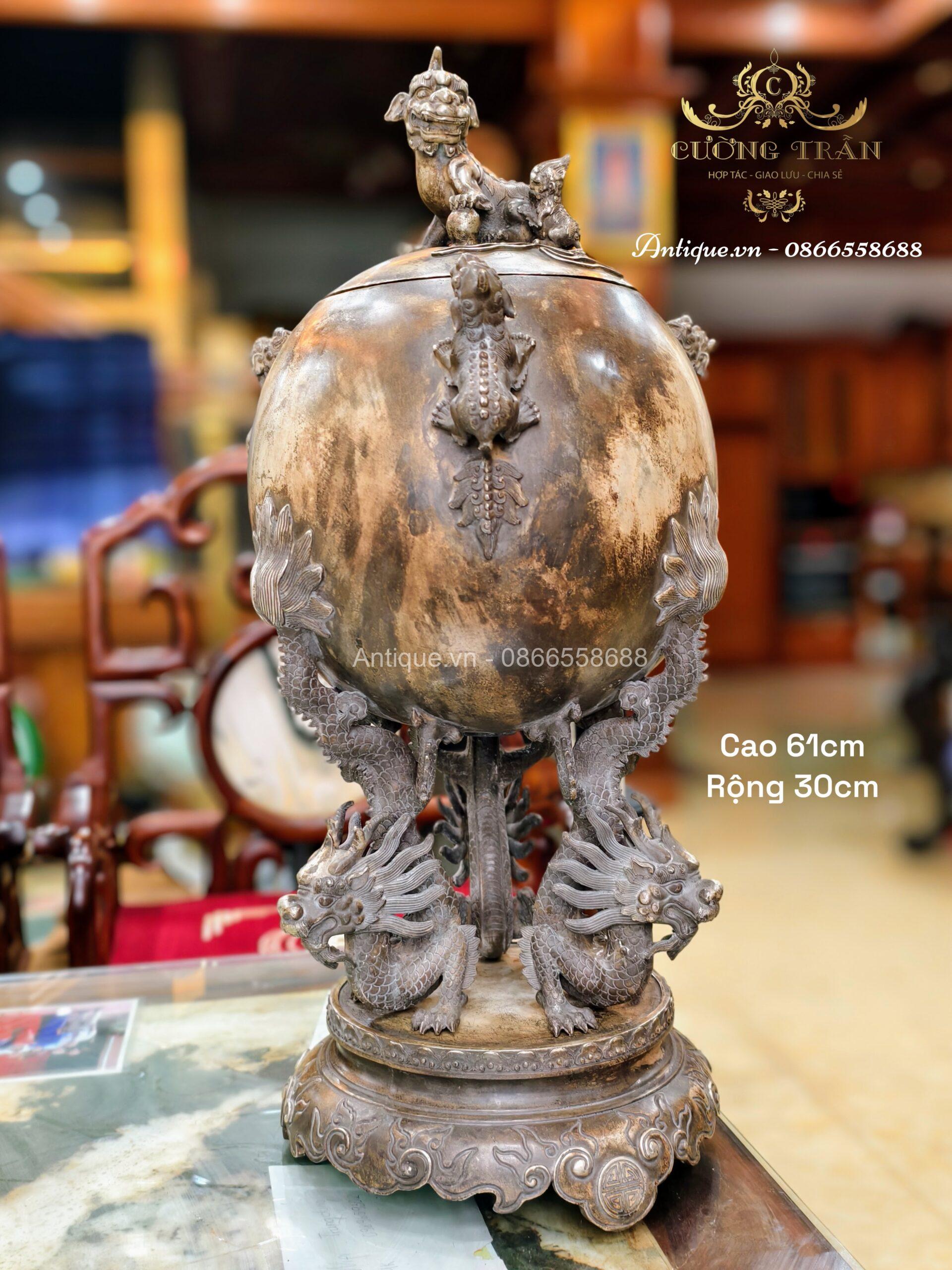 Một chiếc lư xông trầm bằng đồng, bầu đỉnh có hình dạng quả cầu, được chạm khắc năm con lân vờn quanh. Chân đế là được chạm khắc hình rồng làm chân đỡ cho quả cầu chính.