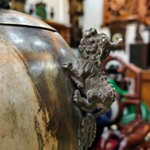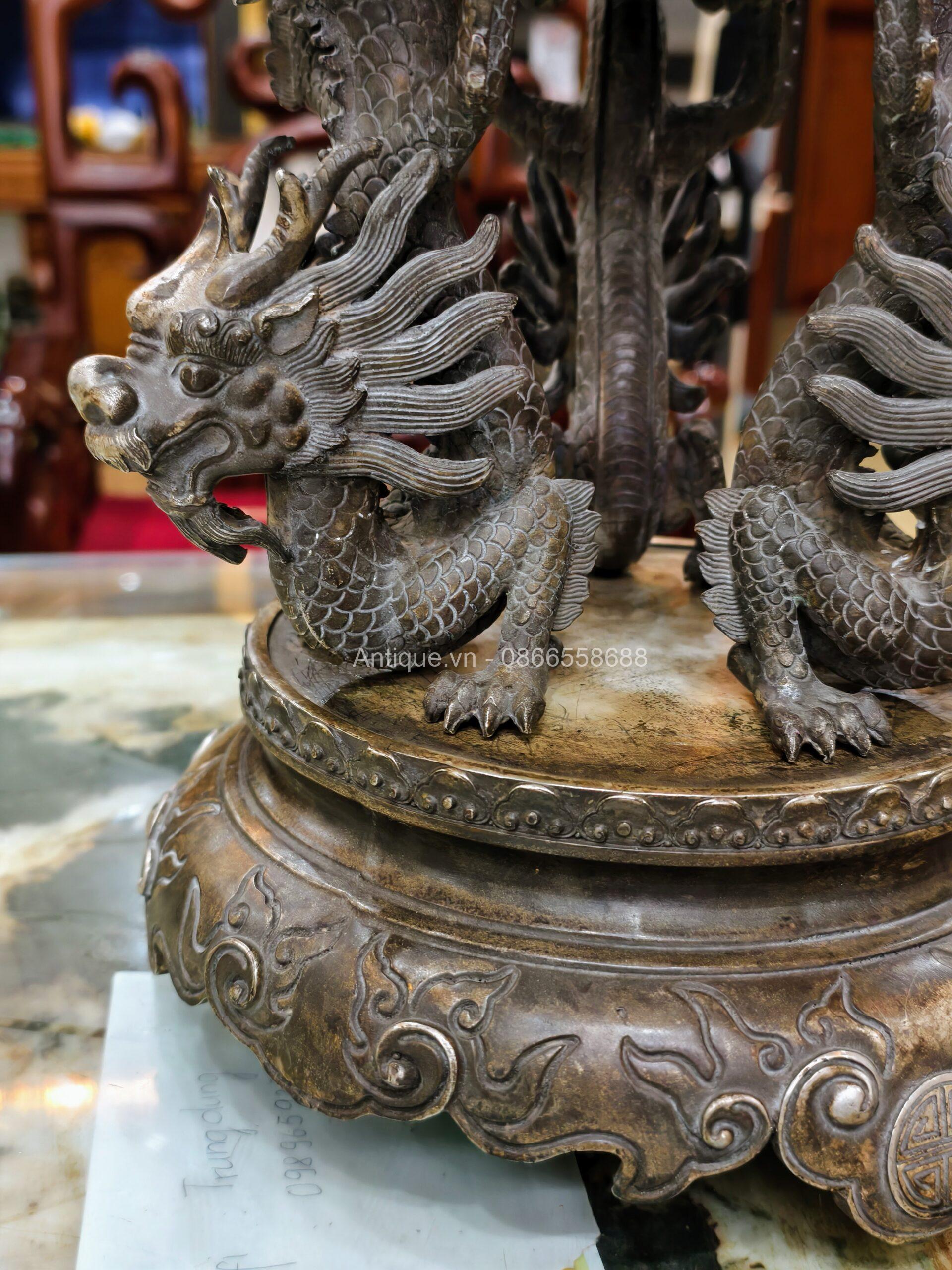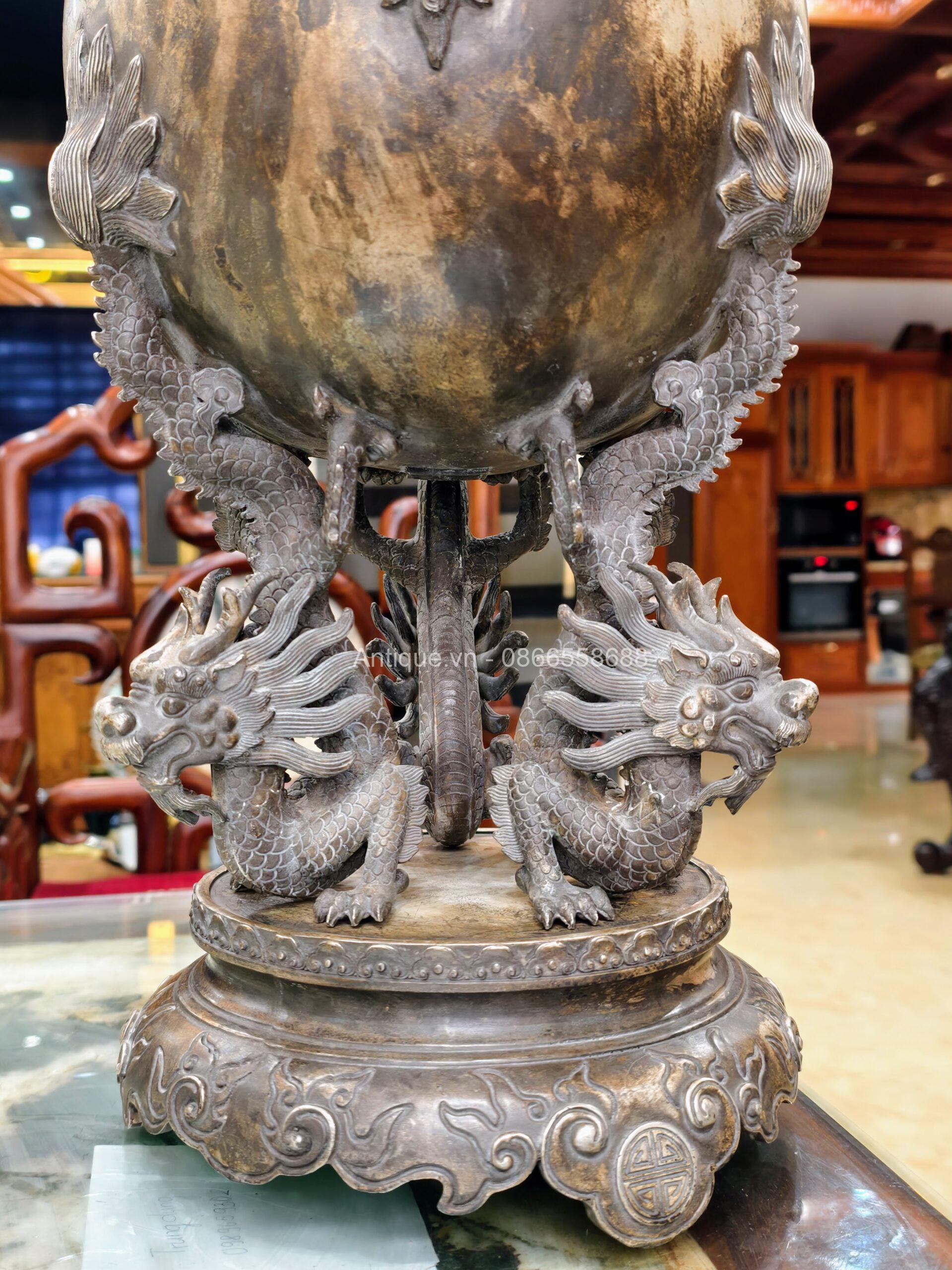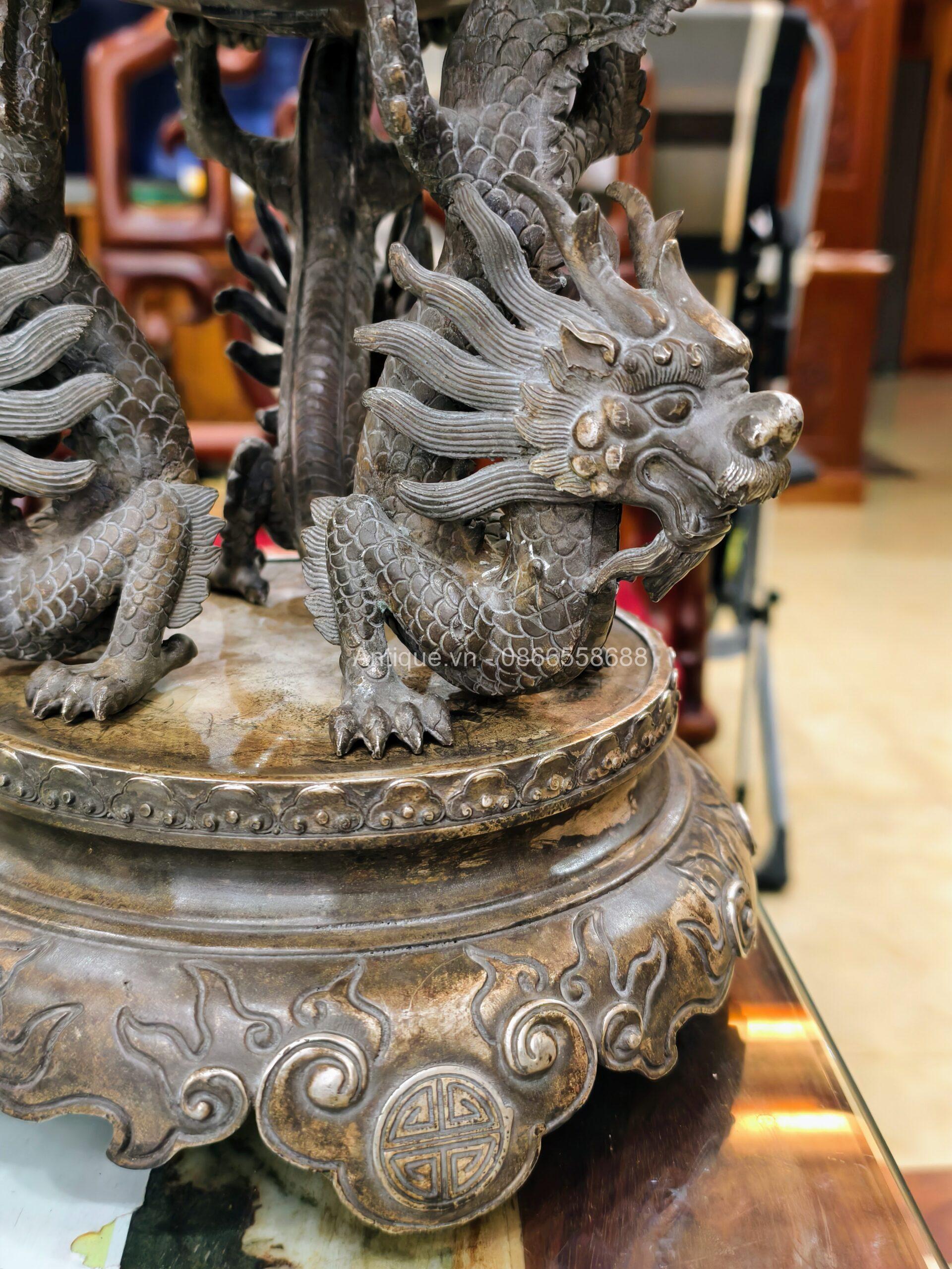 Một chiếc lư xông trầm bằng đồng, bầu đỉnh có hình dạng quả cầu, được chạm khắc năm con lân vờn quanh. Chân đế là được chạm khắc hình rồng làm chân đỡ cho quả cầu chính.