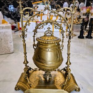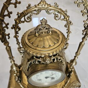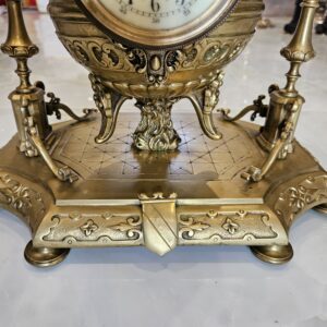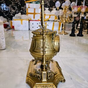 Một chiếc đồng hồ để bàn rất độc đáo, toàn bộ phần thân hình chiếc bình bằng đồng với những họa tiết được chế tác cực kỳ tinh xảo.