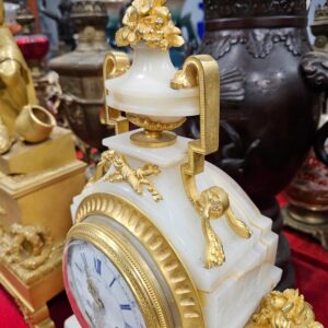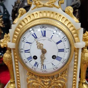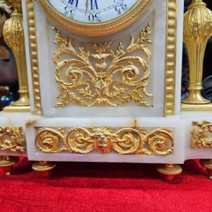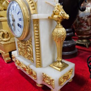 Đồng hồ để bàn, xuất xứ Pháp, toàn thân bằng đá cẩm thạch kết hợp với các chi tiết đồng mạ vàng rất đẹp.