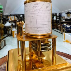 Phía trên là chiếc máy ghi khí áp (barograph) cổ điển, một thiết bị khoa học được sử dụng để đo và ghi lại sự thay đổi của áp suất khí quyển theo thời gian.