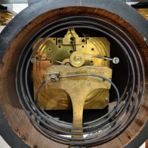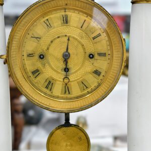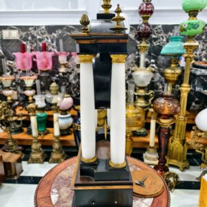 Đồng hồ khải hoàn môn, biểu tượng của sự chiến thắng. Phần đế và trên đỉnh bằng gỗ, bốn cột đá trắng, kết hợp các chi tiết đồng lacke vàng. Mặt và quả lắc đều lacke vàng.