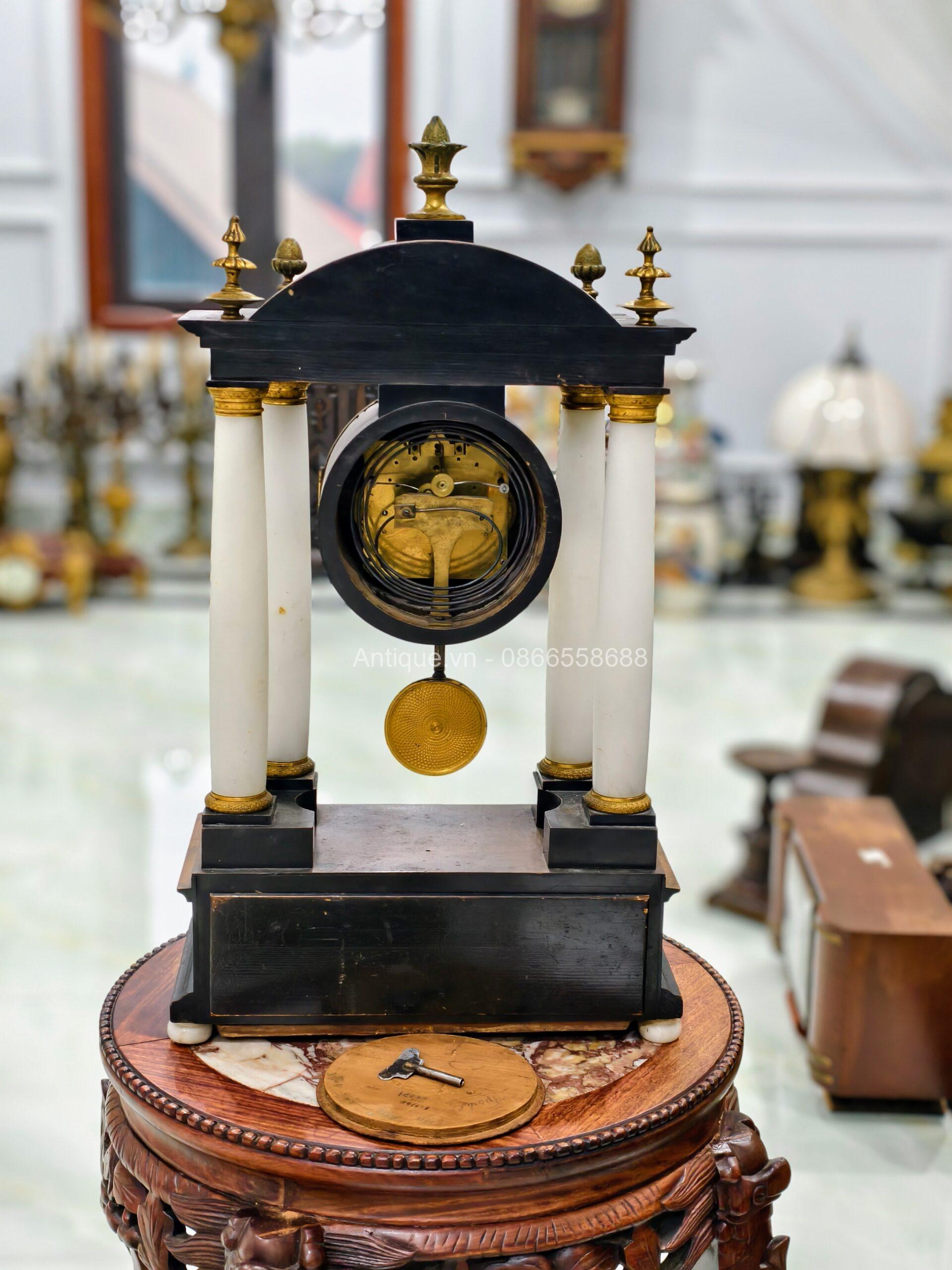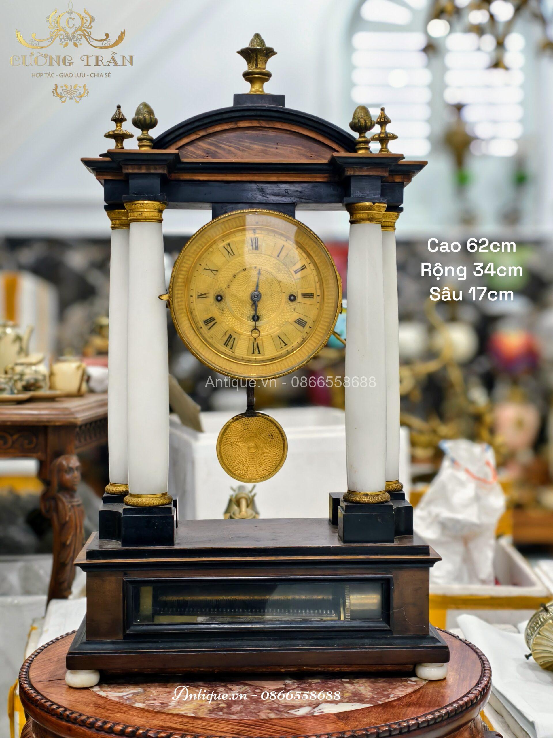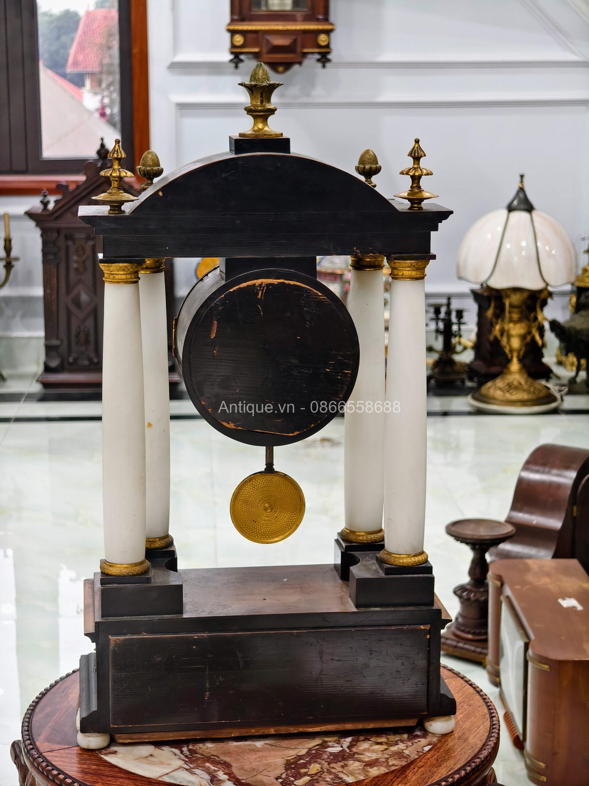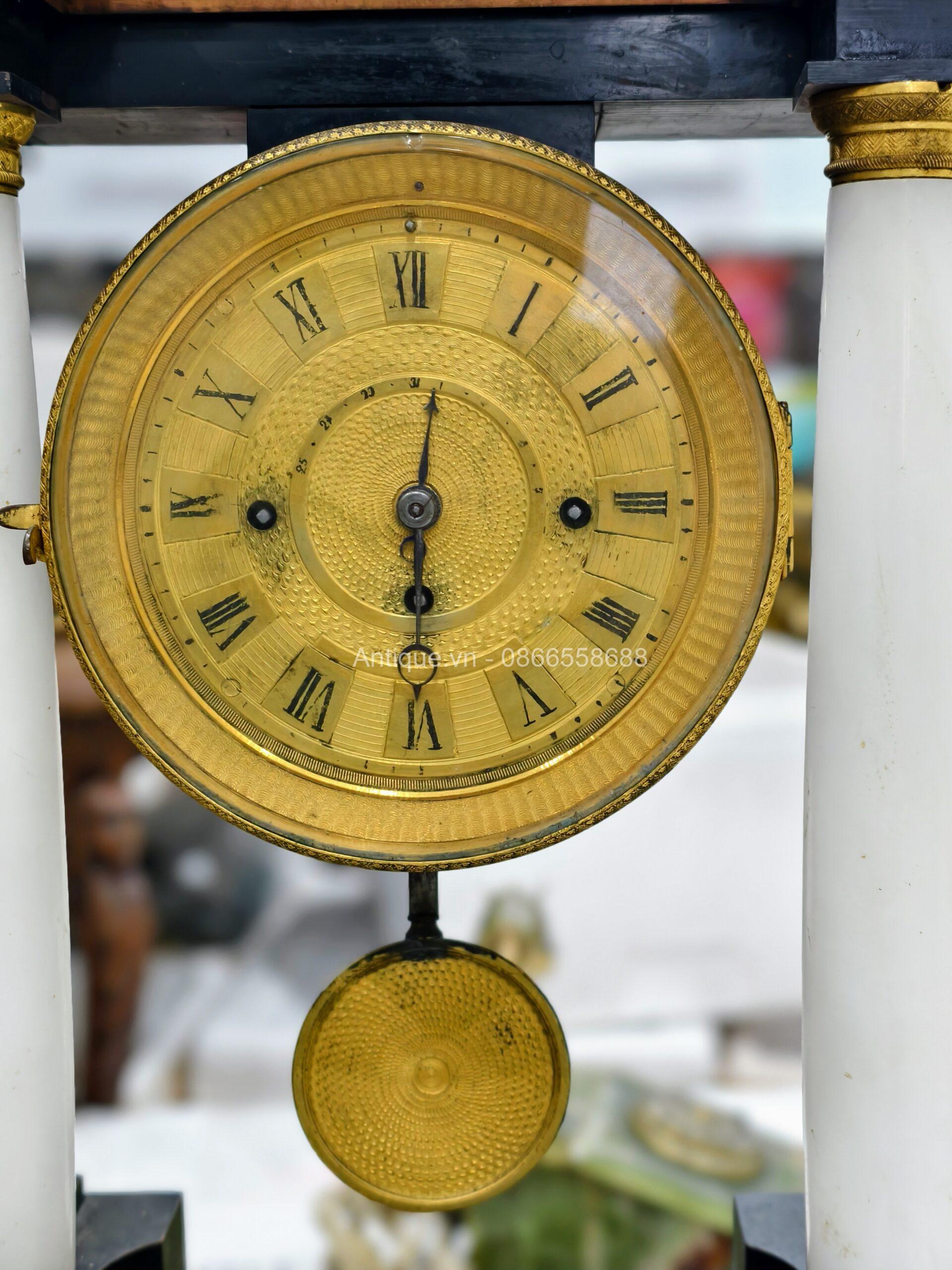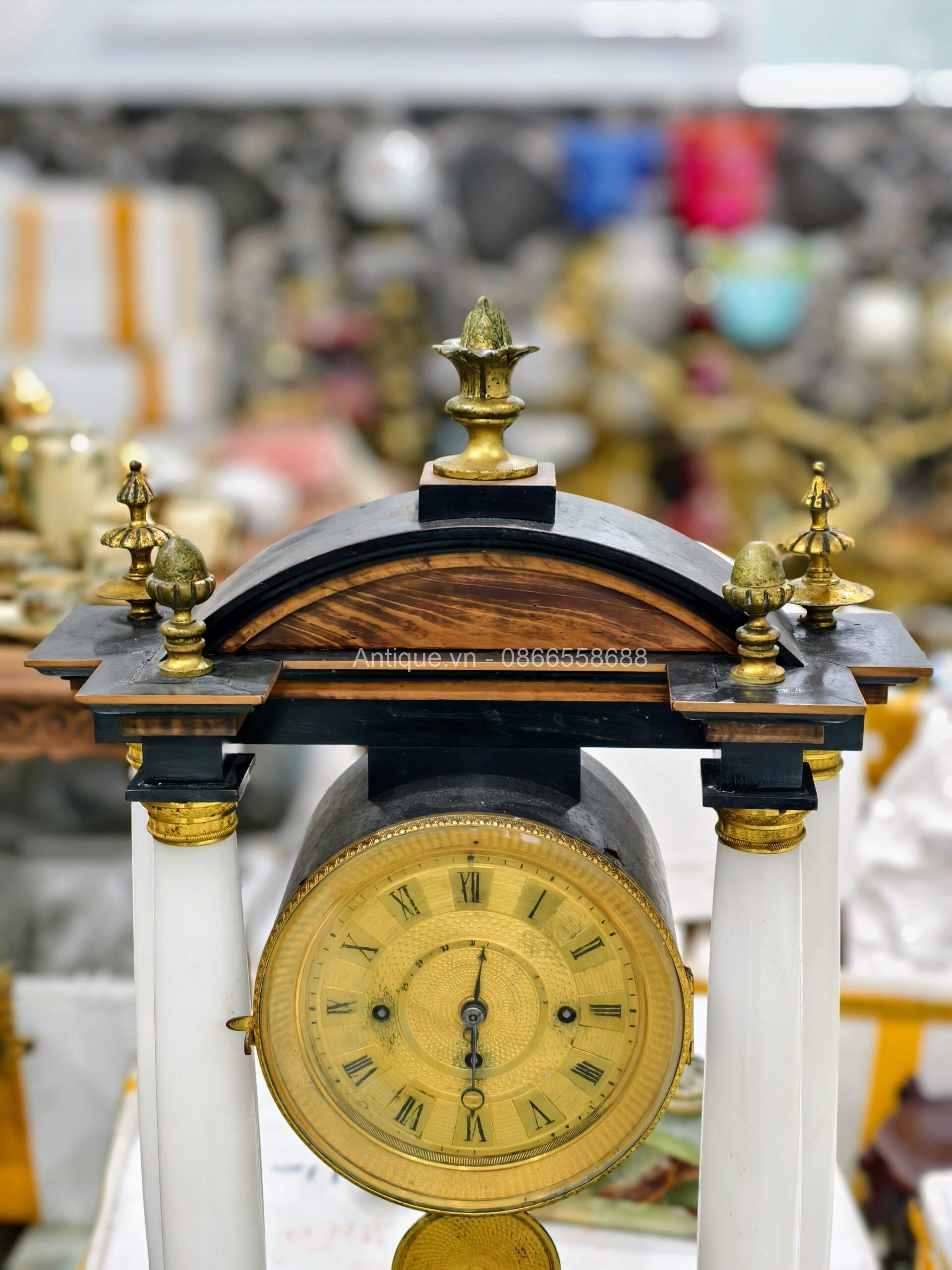 Đồng hồ khải hoàn môn, biểu tượng của sự chiến thắng. Phần đế và trên đỉnh bằng gỗ, bốn cột đá trắng, kết hợp các chi tiết đồng lacke vàng. Mặt và quả lắc đều lacke vàng.