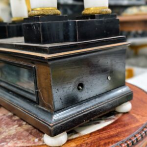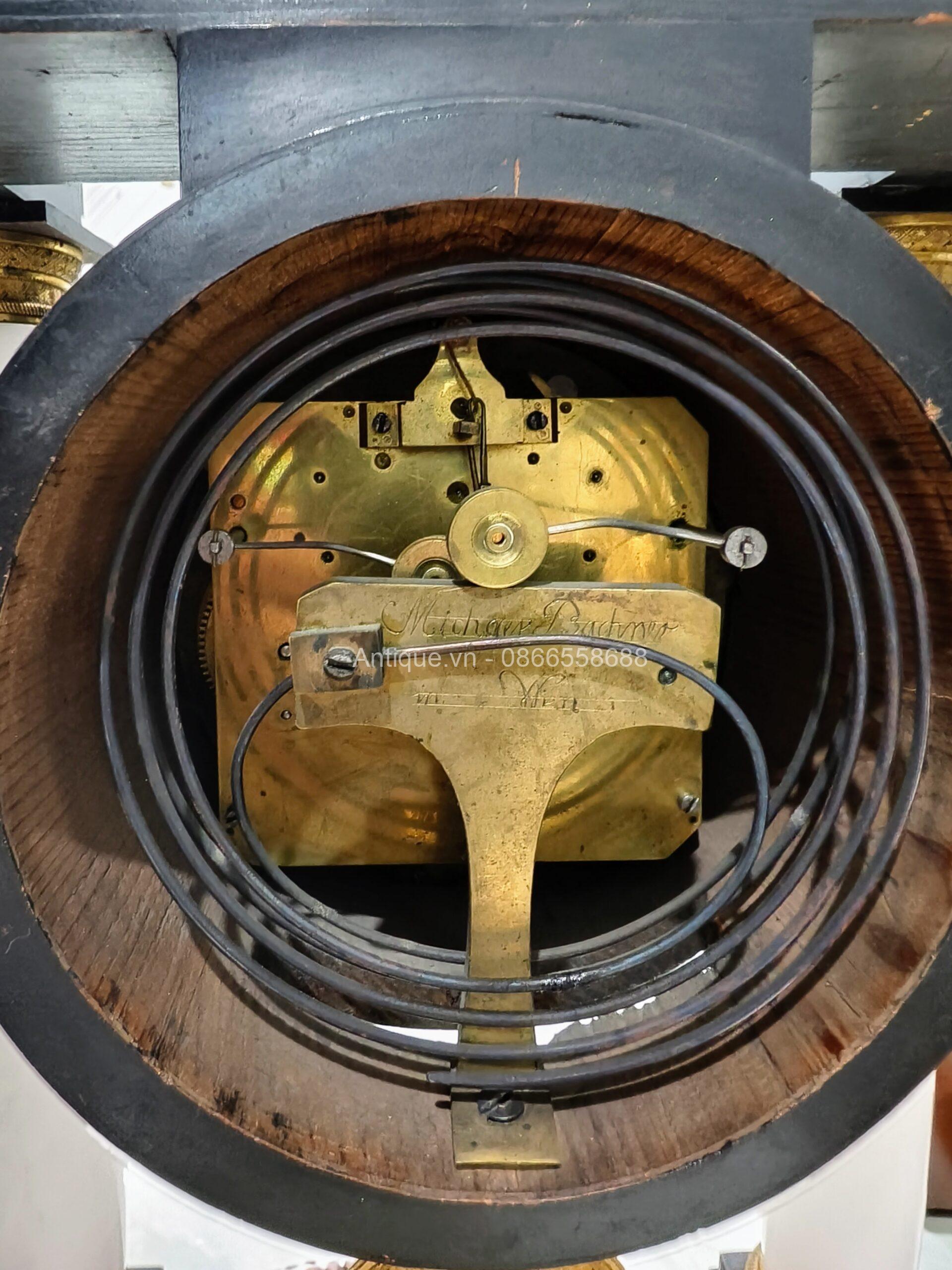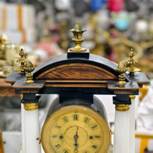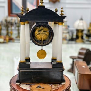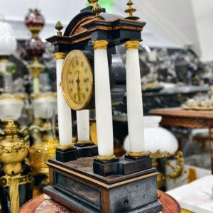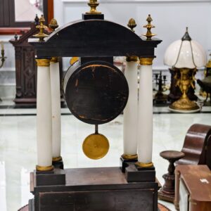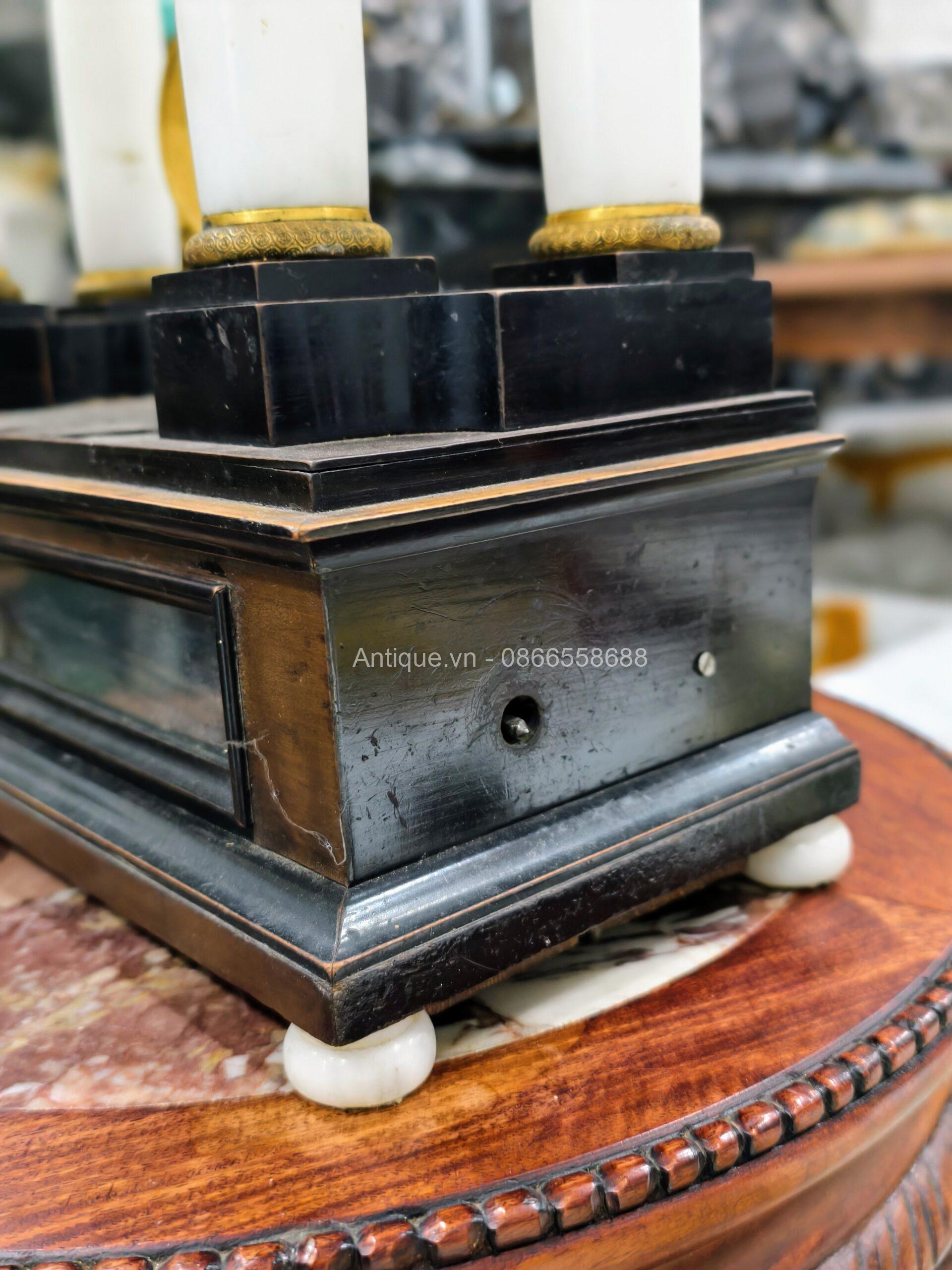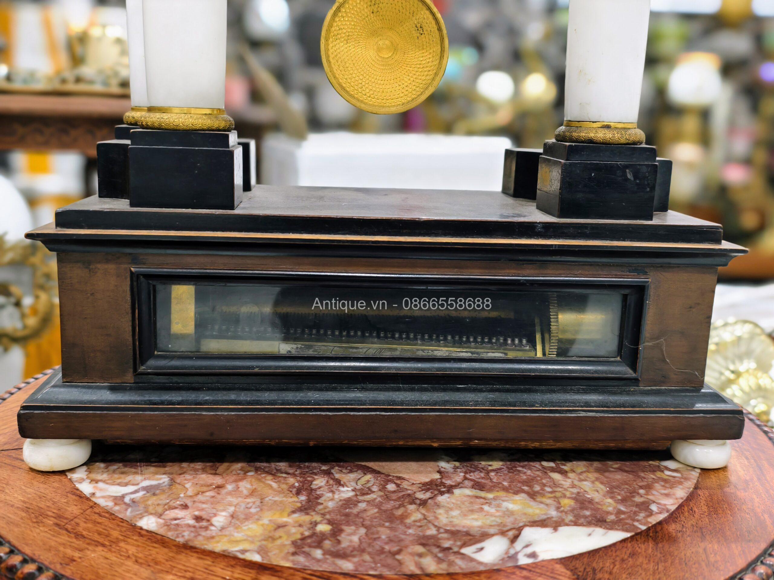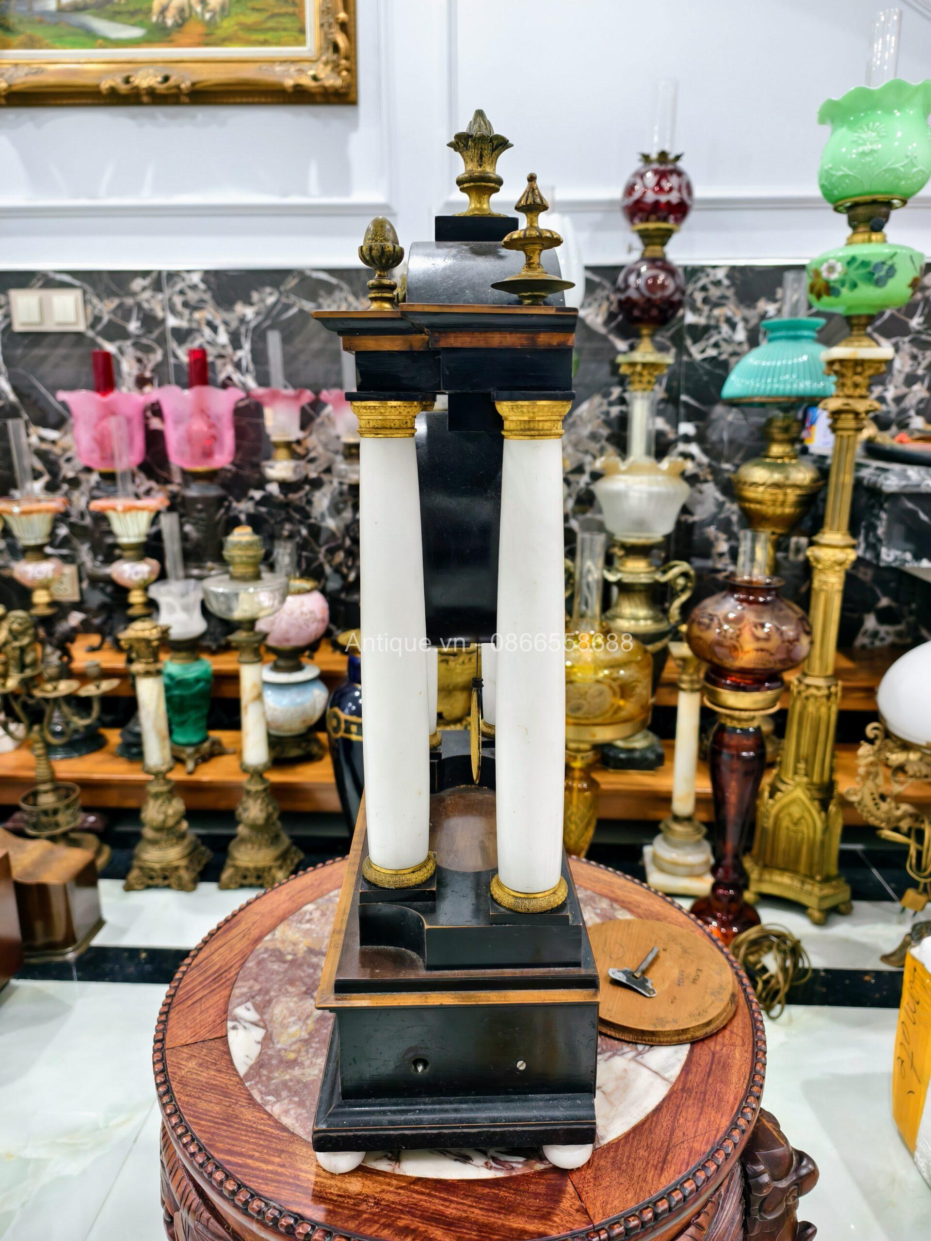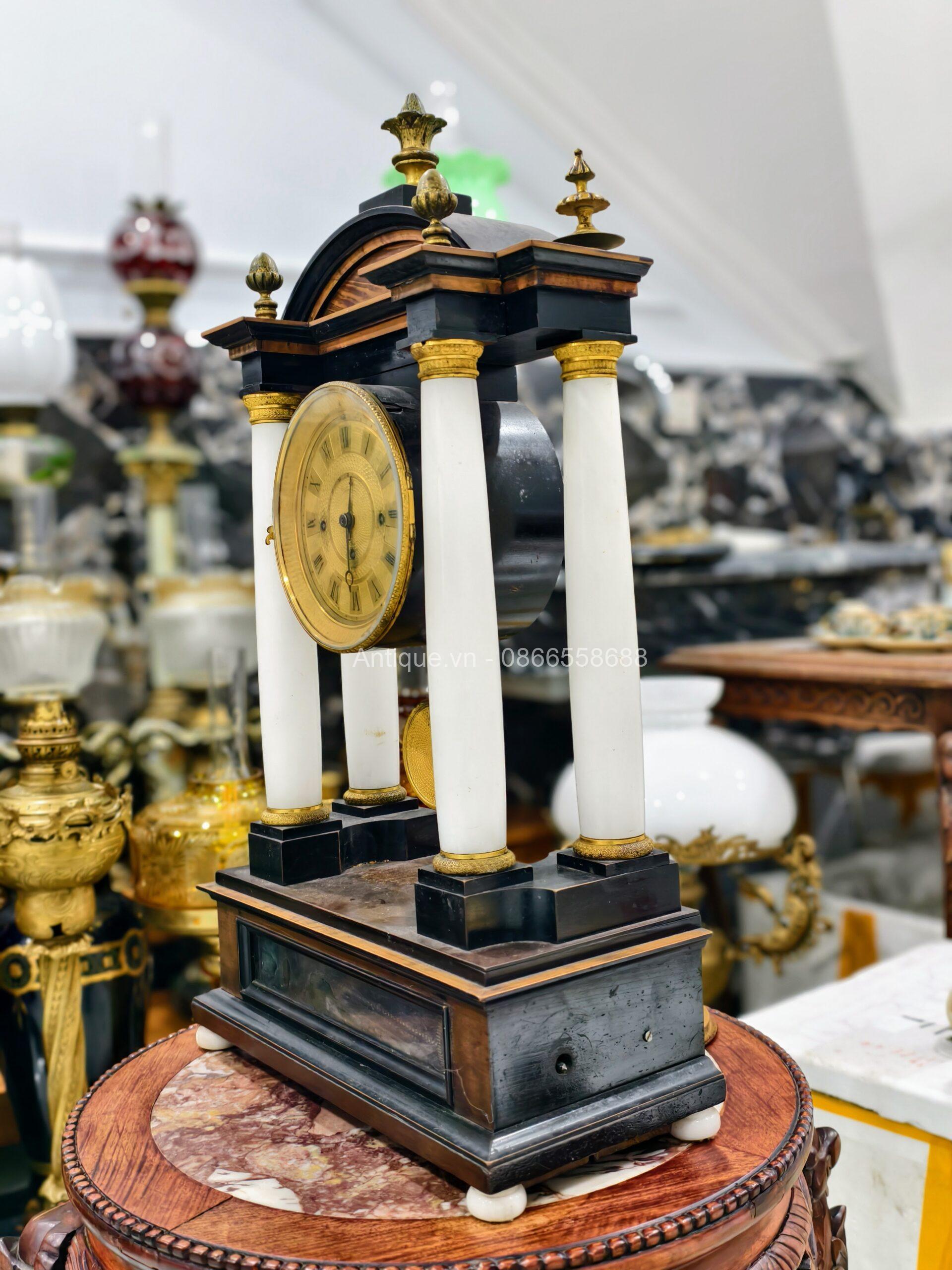 Đồng hồ khải hoàn môn, biểu tượng của sự chiến thắng. Phần đế và trên đỉnh bằng gỗ, bốn cột đá trắng, kết hợp các chi tiết đồng lacke vàng. Mặt và quả lắc đều lacke vàng.