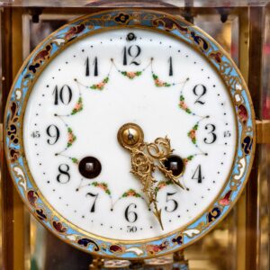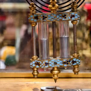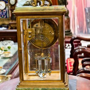 Một chiếc đồng hồ để bàn độc đáo, toàn thân bằng đồng kết hợp họa tiết pháp lam độc đáo. Mặt men, máy Japy, chuông vòng, quả lắc thủy ngân.