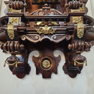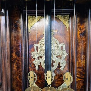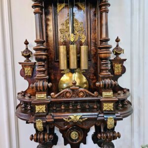 Đồng hồ treo tường, xuất xứ Đức, vỏ gỗ vân nu kết hợp với các chi tiết đồng đẹp và tinh xảo.