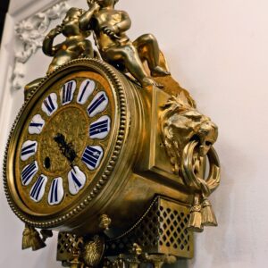 Đồng hồ treo tường, xuất xứ Pháp, toàn thân bằng đồng với kiểu dáng độc đáo. Phía trên và bên dưới là tượng cu tí tinh xảo.