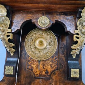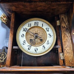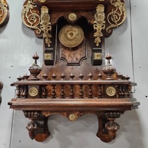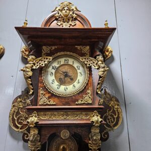 Đồng hồ treo tường, xuất xứ Đức, thùng gỗ vân nu kết hợp với các chi tiết đồng rất đẹp và tinh xảo.