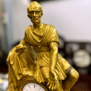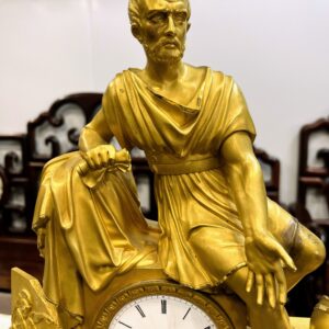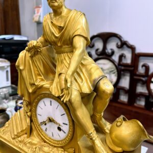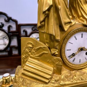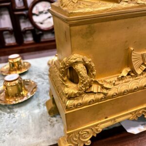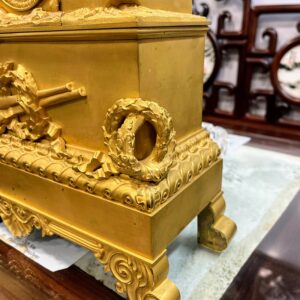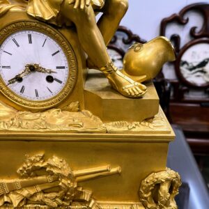 Đồng hồ tượng, xuất xứ Pháp. Đồng hồ và tượng bằng đồng lacke vàng với những họa tiết cực kỳ sắc nét.