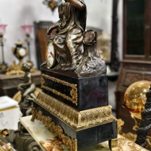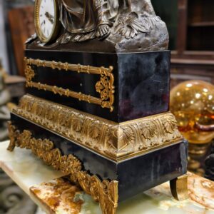 Phần đế của đồng hồ được trang trí bằng các họa tiết hoa văn và các chi tiết mạ vàng, kết hợp đá cẩm thạch đen tạo nên vẻ sang trọng và cổ điển.