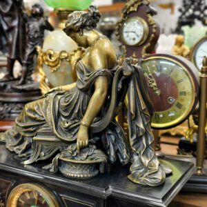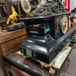 Đồng hồ tượng, xuất xứ Pháp. Tượng đồng nàng thơ ngồi trên bệ đá đen nguyên khối, phần trước có điểm đá malachite. Chân móng rồng tinh xảo.